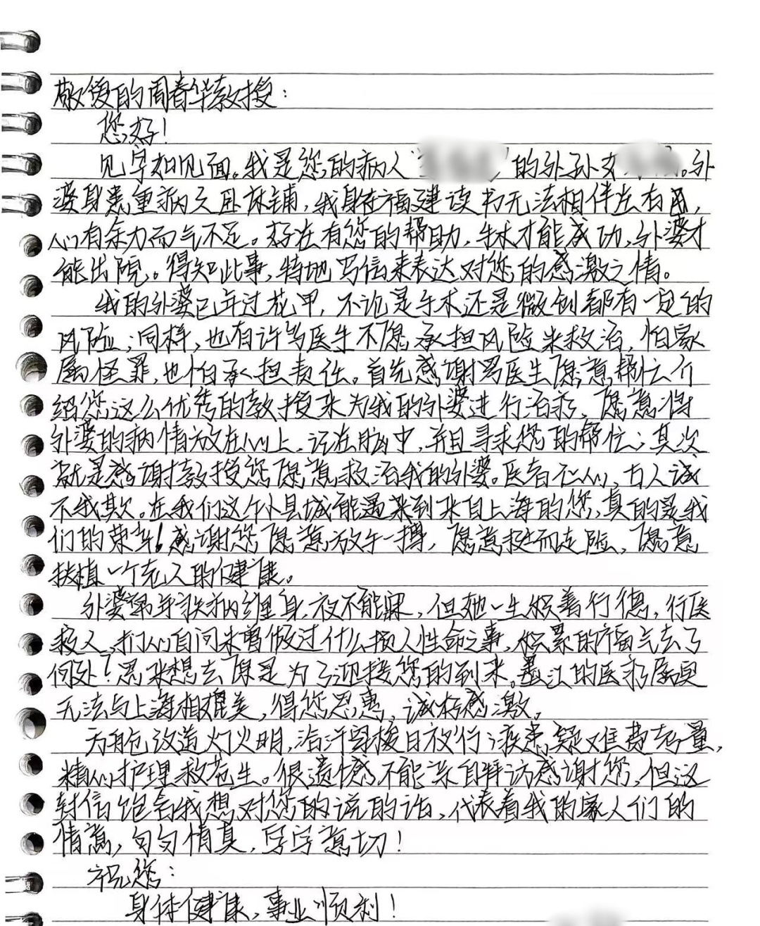李奶奶特意请远在外地读书的外孙女,替她写下一封长长的感谢信。信中写道:“在我们这个小县城能遇到来自上海的您,真的是我们的荣幸!”