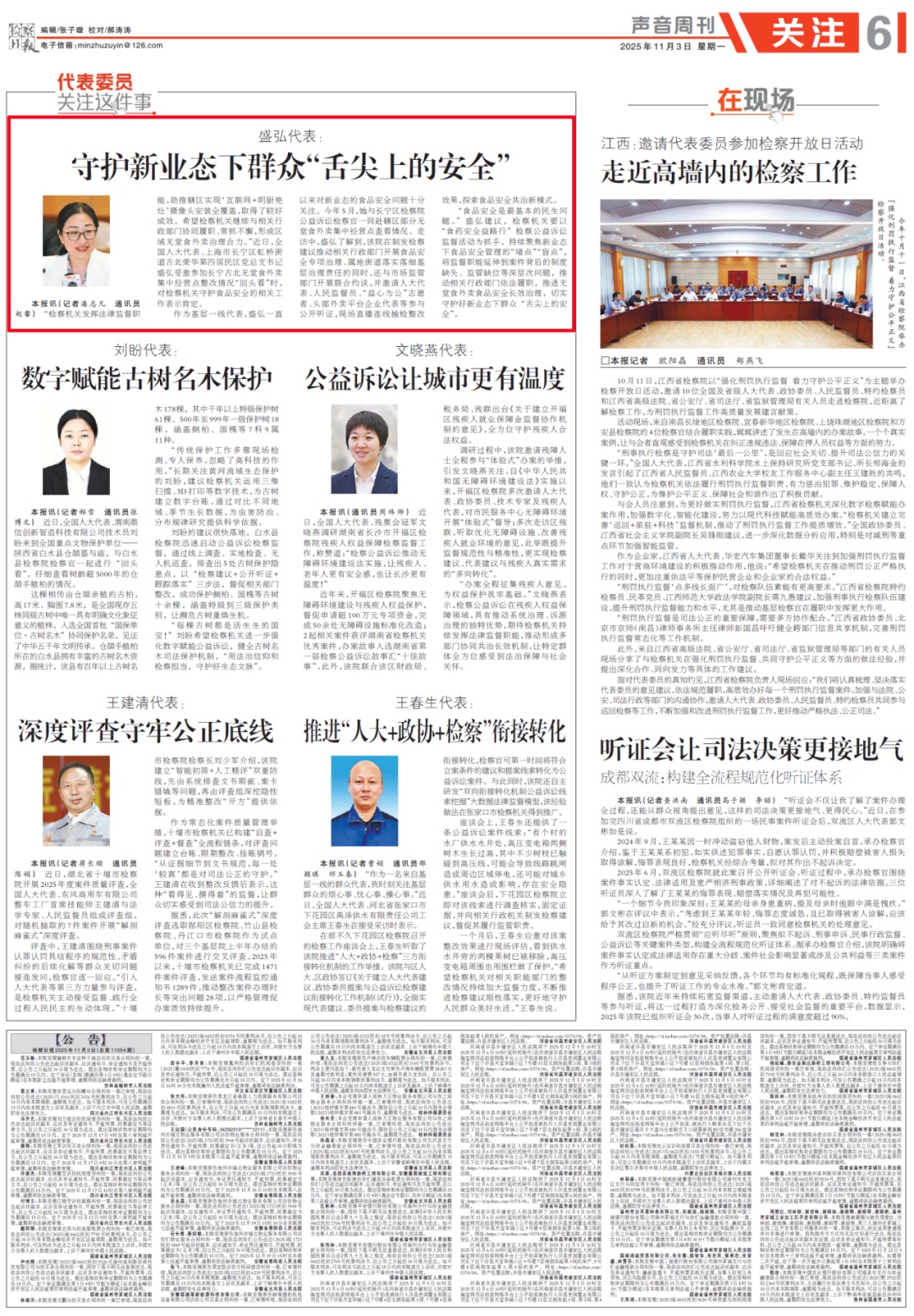 作为基层一线代表,盛弘一直以来对新业态的食品安全问题十分关注。今年5月,她与长宁区检察院公益诉讼检察官一同赴辖区部分无堂食外卖集中经营点查看情况。走访中,盛弘了解到,该院在制发检察建议推动相关行政部门开展食品安全专项治理、属地街道落实落细基层治理责任的同时,还与市场监管部门开展联合约谈,并邀请人大代表、人民监督员、“益心为公”志愿者、头部外卖平台企业代表等参与公开听证,现场直播连线抽检整改效果,探索食品安全共治新模式。