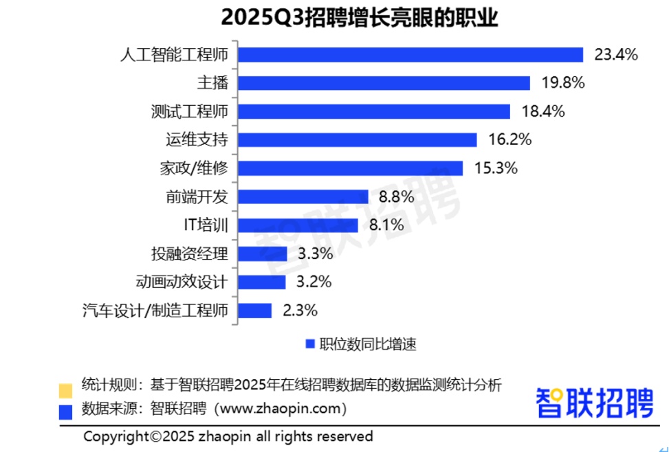 智联招聘2025年第三季度招聘数据显示,人工智能工程师的招聘需求同比增速达到23.4%;主播的需求增速也高达19.8%。