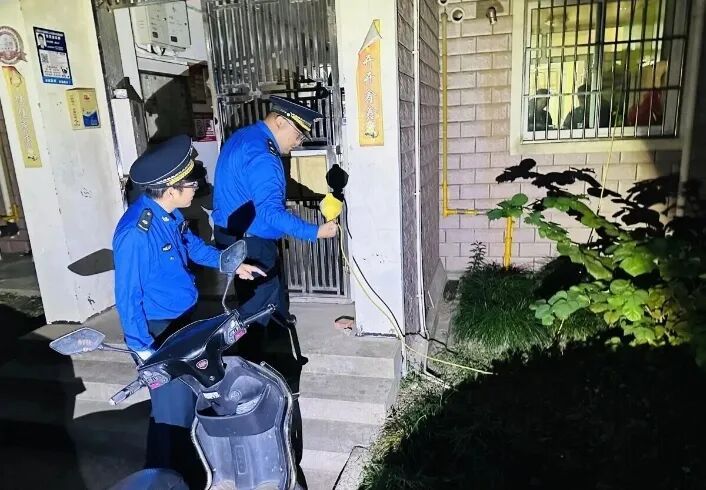随着夜幕降临,几名执法队员分别前往昌鑫花园和海德名园的几栋居民楼进行查看,发现尽管此前已进行广泛宣传,但依然有部分居民抱有侥幸心理,他们将电动自行车停放于楼道以及消防通道,再把一根根电线从窗口垂落充电。“有的电线一直就这样垂在外面,日晒雨淋,我们看着都担心。”有居民说道,电线极易老化、短路,加上夜间充电无人看管,潜藏着极大的安全隐患风险。随后,执法人员对发现的“飞线”予以当场清理,并引导居民使用小区更新的充电设备,“整治+教育”双管齐下,从源头推动安全用电。