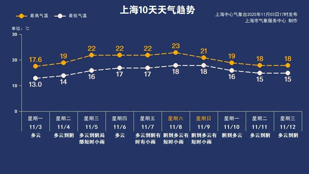 11月8日(周六):阴到多云有短时小雨,18~23℃
