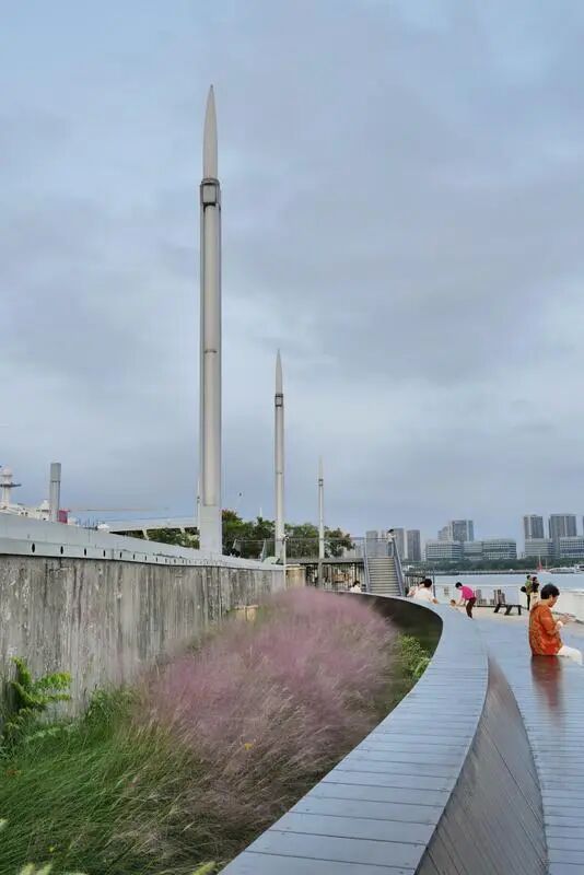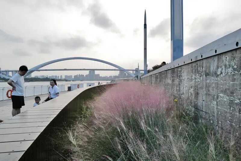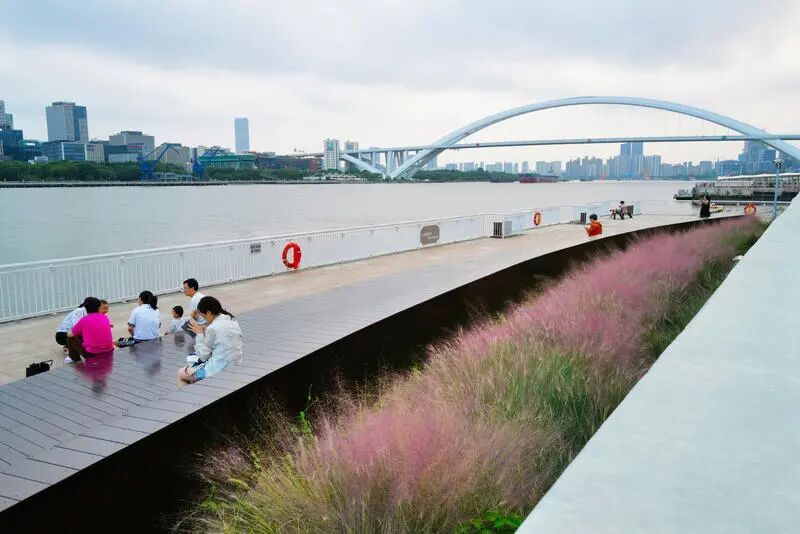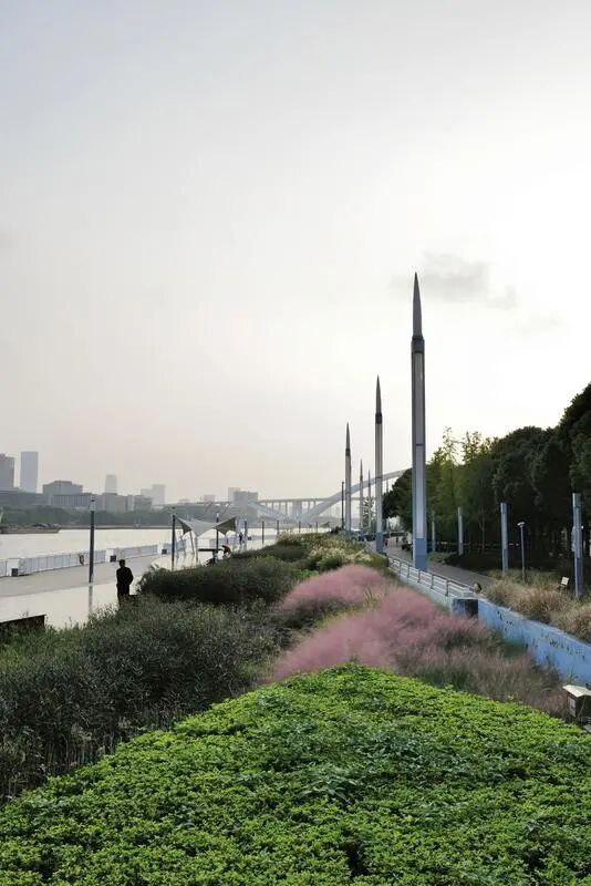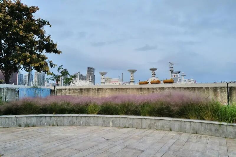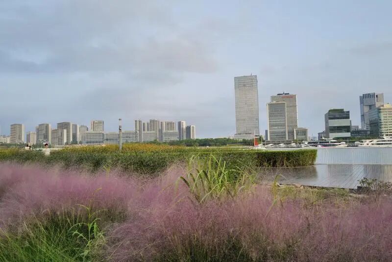 趁着秋日,你可以散步在黄浦滨江,吹着凉爽的江风欣赏沿路的风景。花坛中的粉黛乱子草在一众植物中显得相当惹眼。