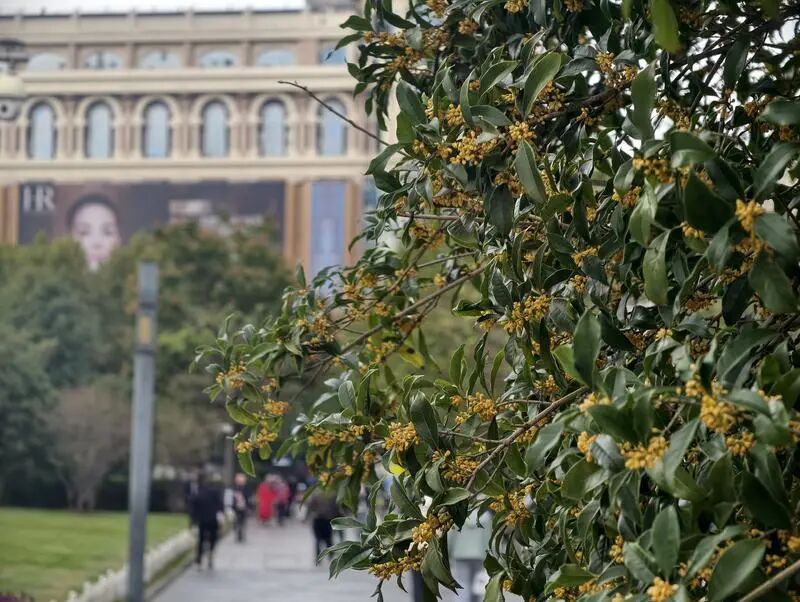 人民广场1号门外的桂花正当盛时,地铁站旁暗香袭人,引得往来行人驻足流连。