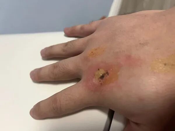 由于燃烧物四处飞溅,肖天阳双手均出现不同程度烫伤。“手被烫到确实有刺痛感,但我也没多想,只想着将影响降到最低。”肖天阳说。