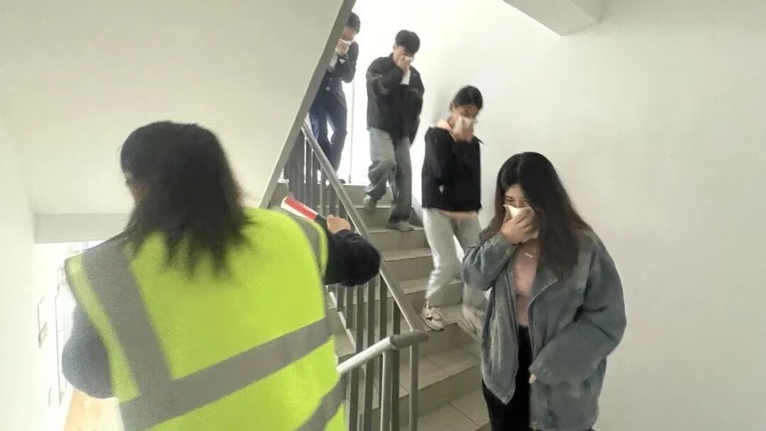 现场,模拟火灾的烟雾升起,急促的警报声响彻整栋公寓。工作人员发现“火情”后,立即启动应急预案:大声呼救、按下火警、提取灭火器,并逐户敲门引导住户用湿毛巾捂住口鼻,压低身体撤离。在引导员的指挥下,参训人员严格遵循疏散路线,快速有序撤离至安全地带。