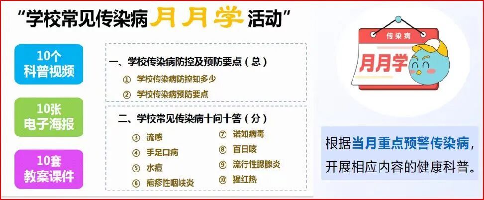 项目还打造了全国首个以月度主题为核心的“学校常见传染病月月学”科普品牌,内容覆盖诺如病毒感染性腹泻、手足口病、水痘、流感、疱疹性咽峡炎等学校高发传染病,通过常态化科普推动防控教育关口前移。