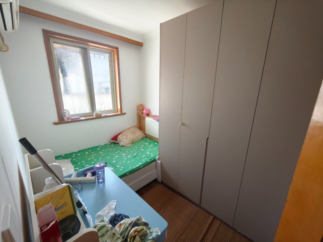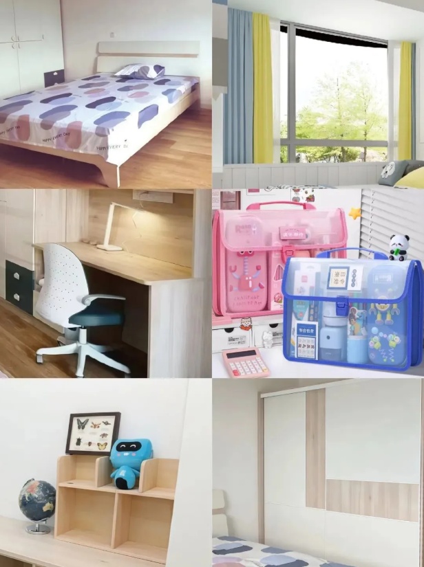 靠窗的位置,摆放着一张崭新的书桌,另一侧,是一张铺着干净床单的床,床单上的图案清新可爱。头顶上,是一盏可以调节灯光亮度的风扇灯,它既能在炎热的夏日带来清凉,又能在寒冷的夜晚送来温暖。