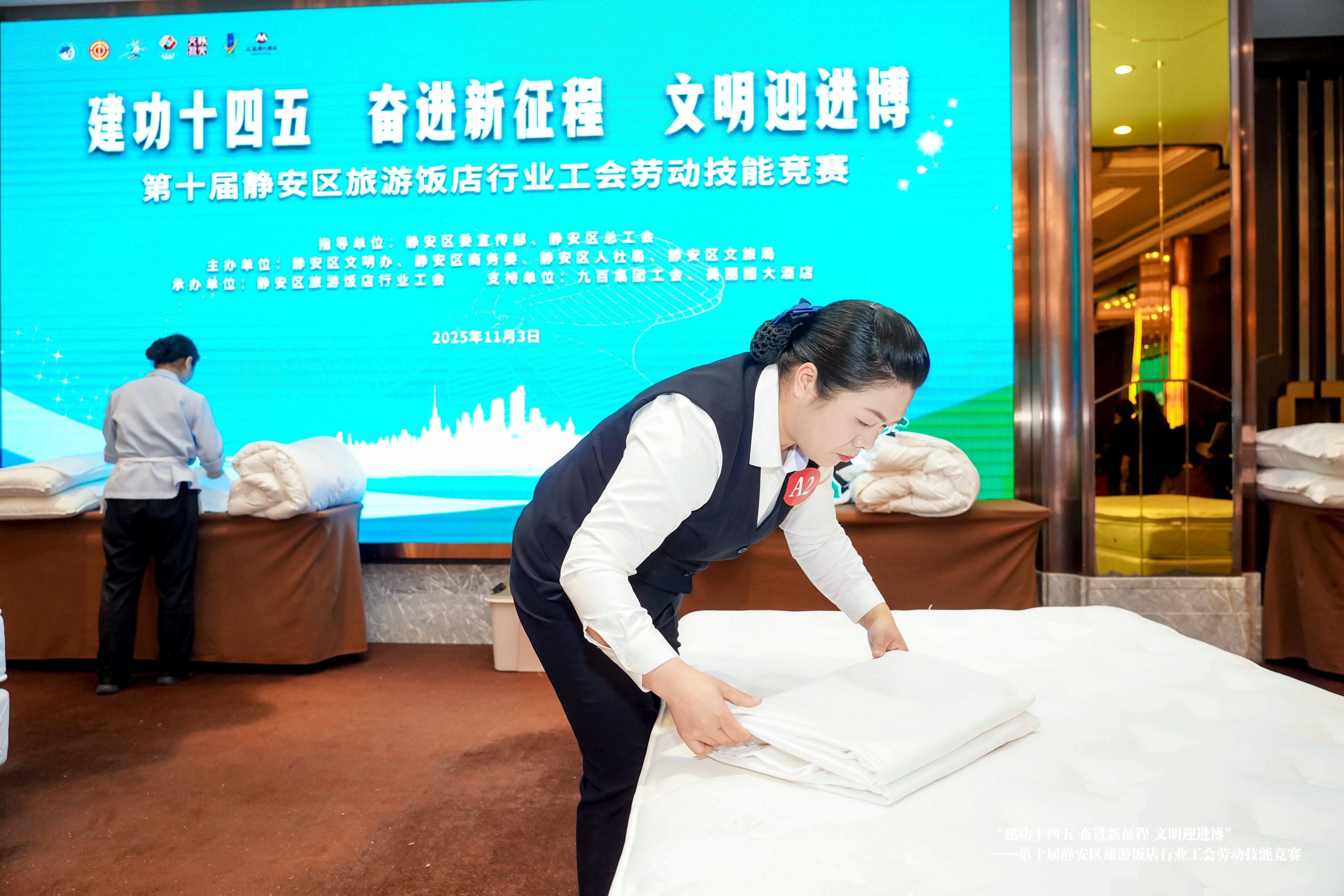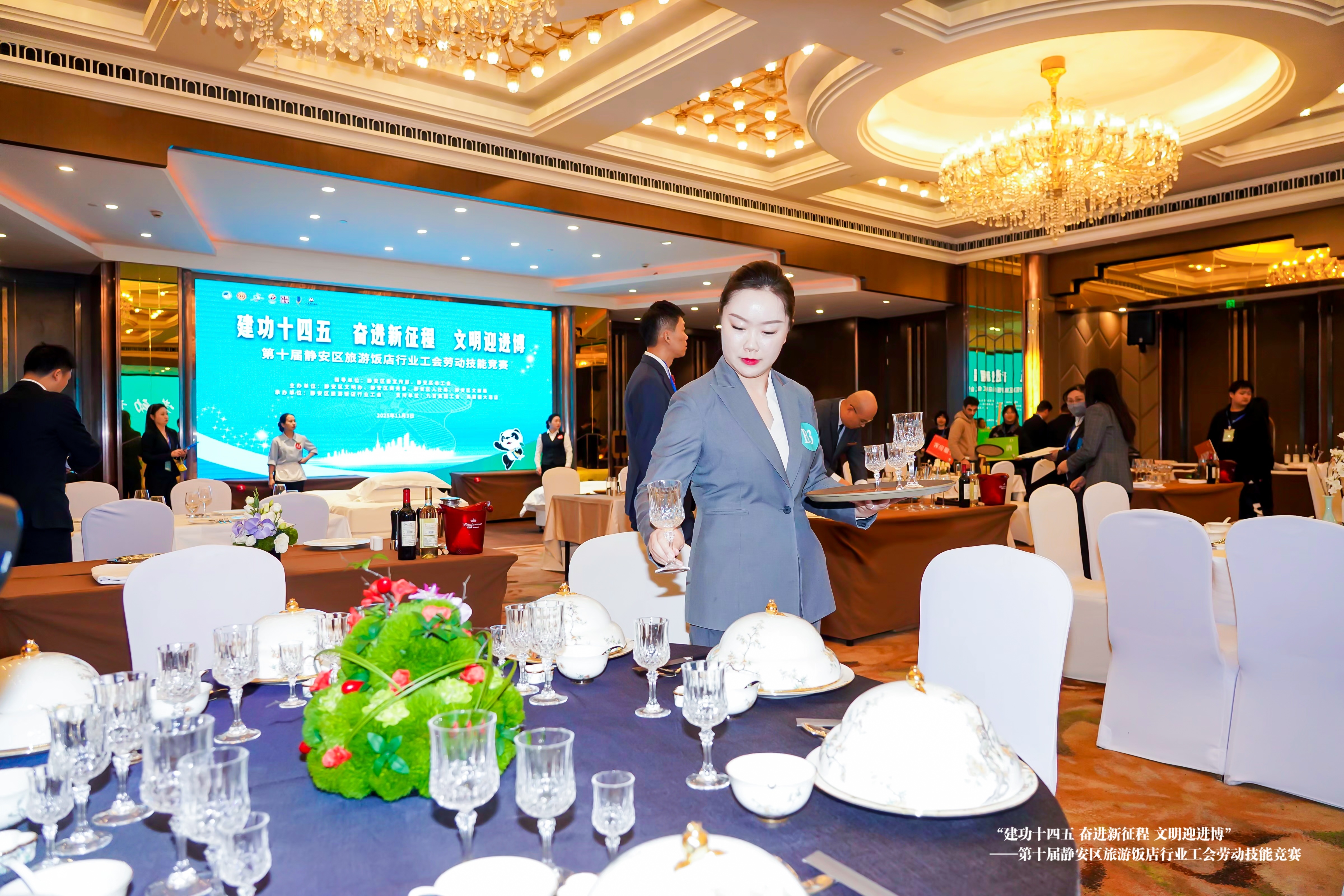 本次劳动竞赛聚焦技能实操,设有中式铺床、中餐摆台、西餐摆台和调酒四个项目。20支参赛队伍的51名选手不仅在规定时间内完成各项技能的规范操作,还将创新性和艺术性融入各自的作品中,以娴熟精湛的技能和专业规范的服务展现静安窗口的文明形象。