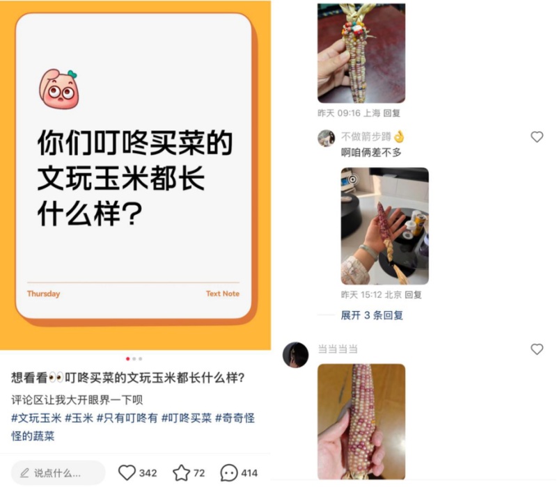 这波新风尚的背后,源自叮咚买菜平台上一款新品——文玩玉米,其上线后凭借独特的形态与“可盘玩”的特性,迅速在社交媒体收获一批“自来水”粉丝,俨然成为年轻人新的情绪治愈单品。