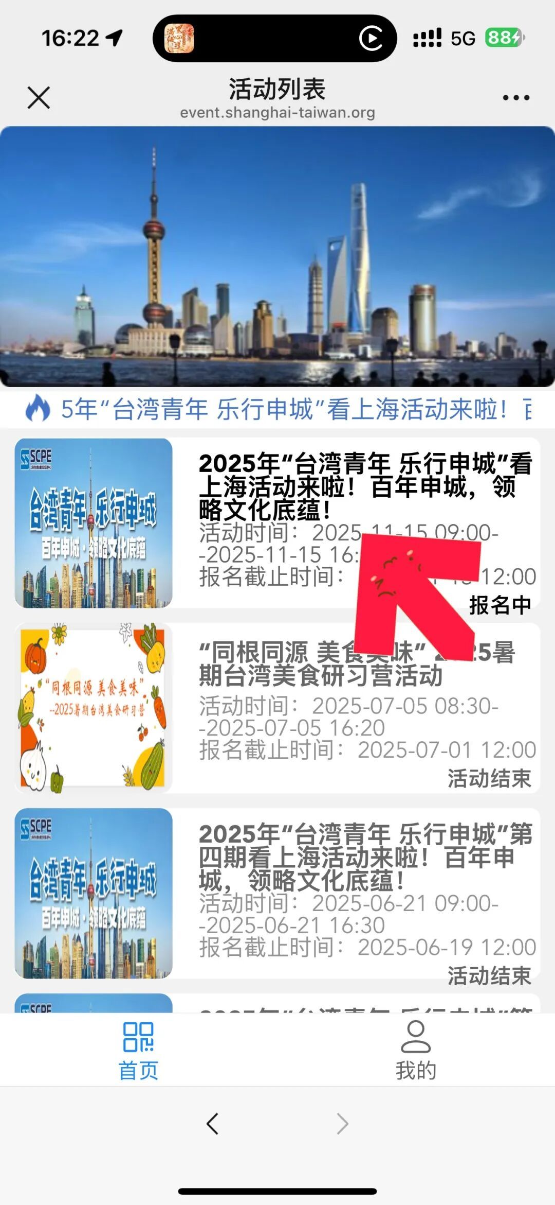 2、从底部菜单栏进入“活动报名”页面,选择“2025年‘台湾青年 乐行申城’看上海活动”,提交报名信息。