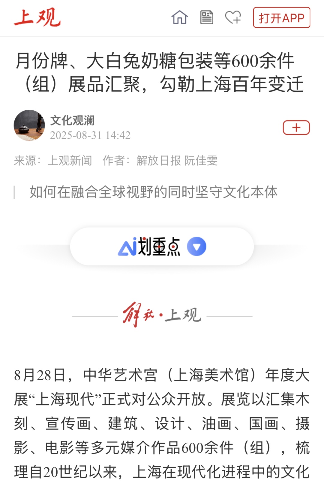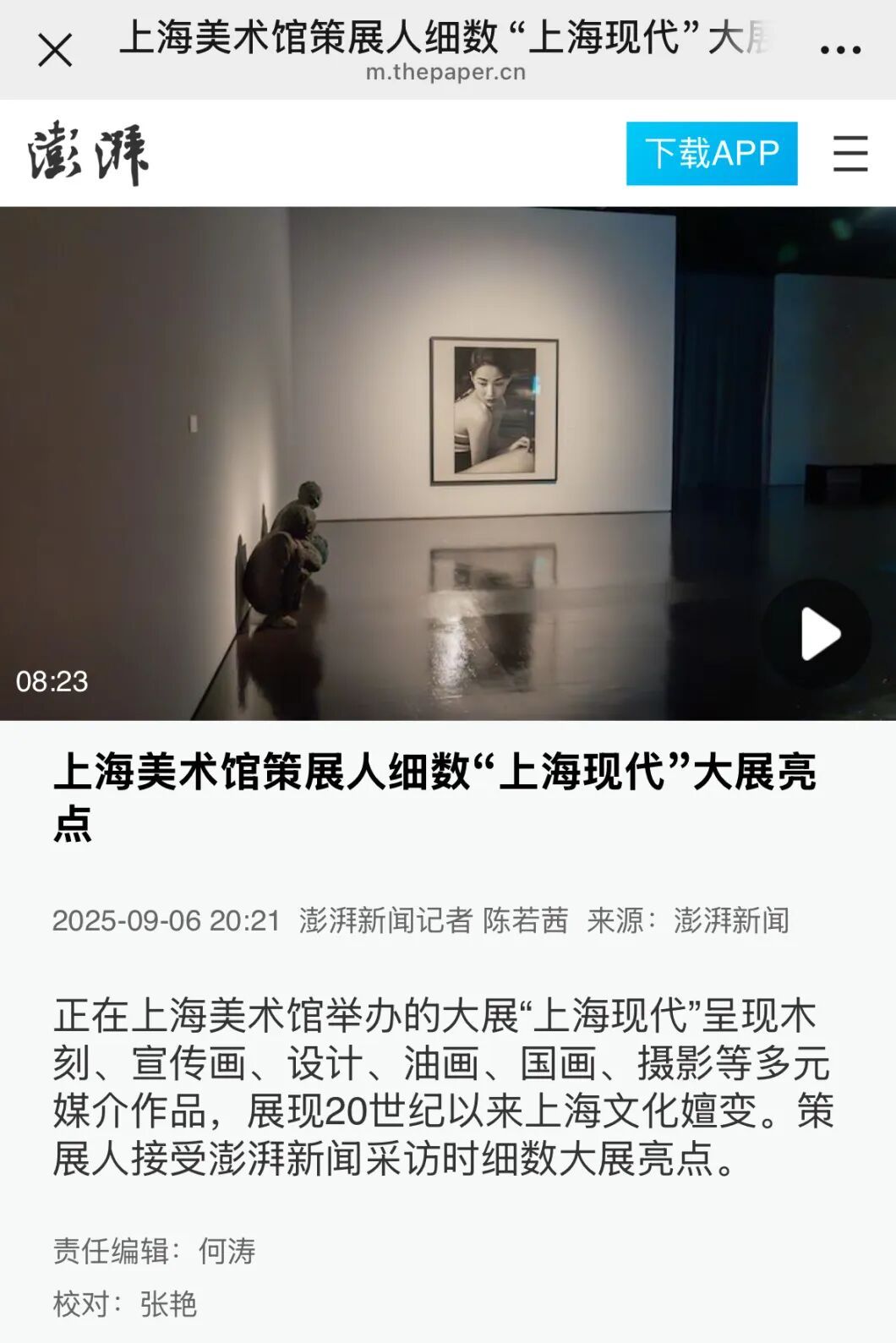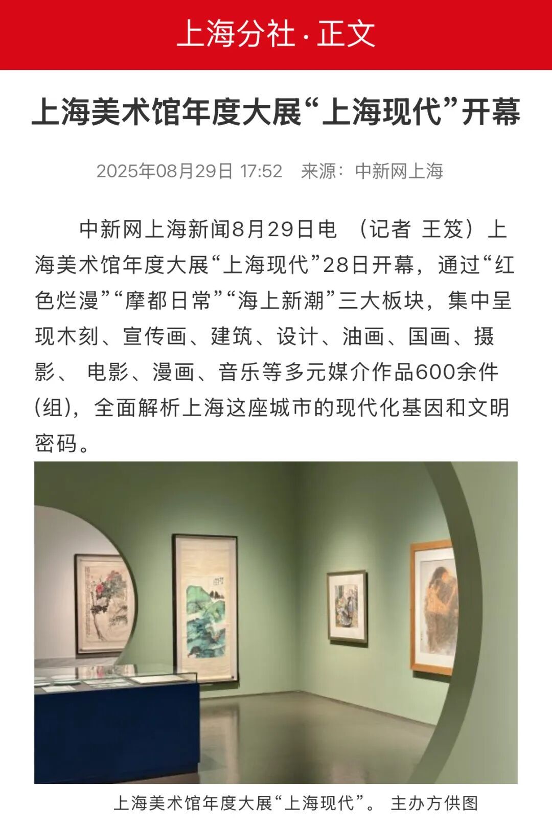 2025年10月7日,“上海现代”大展在上海美术馆圆满落幕。此次展览由上海美术馆主办,国家艺术基金、上海文化发展基金会、上海市对外文化交流协会支持,中国近现代新闻出版博物馆、常熟市文化博览中心(庞薰琹美术馆)、上海宋庆龄故居纪念馆协办。展览通过“红色烂漫”、“摩都日常”、“海上新潮” 三大板块的详实叙事展现20世纪以来上海的文化嬗变,集中呈现木刻、宣传画、建筑、设计、油画、国画、摄影、 电影、漫画、音乐等多元媒介作品600余件(组),全面解析这座城市的现代化基因和人民创造历史的文明密码,如一卷恢弘又细腻的城市画卷在时代浪潮中绽放新声。