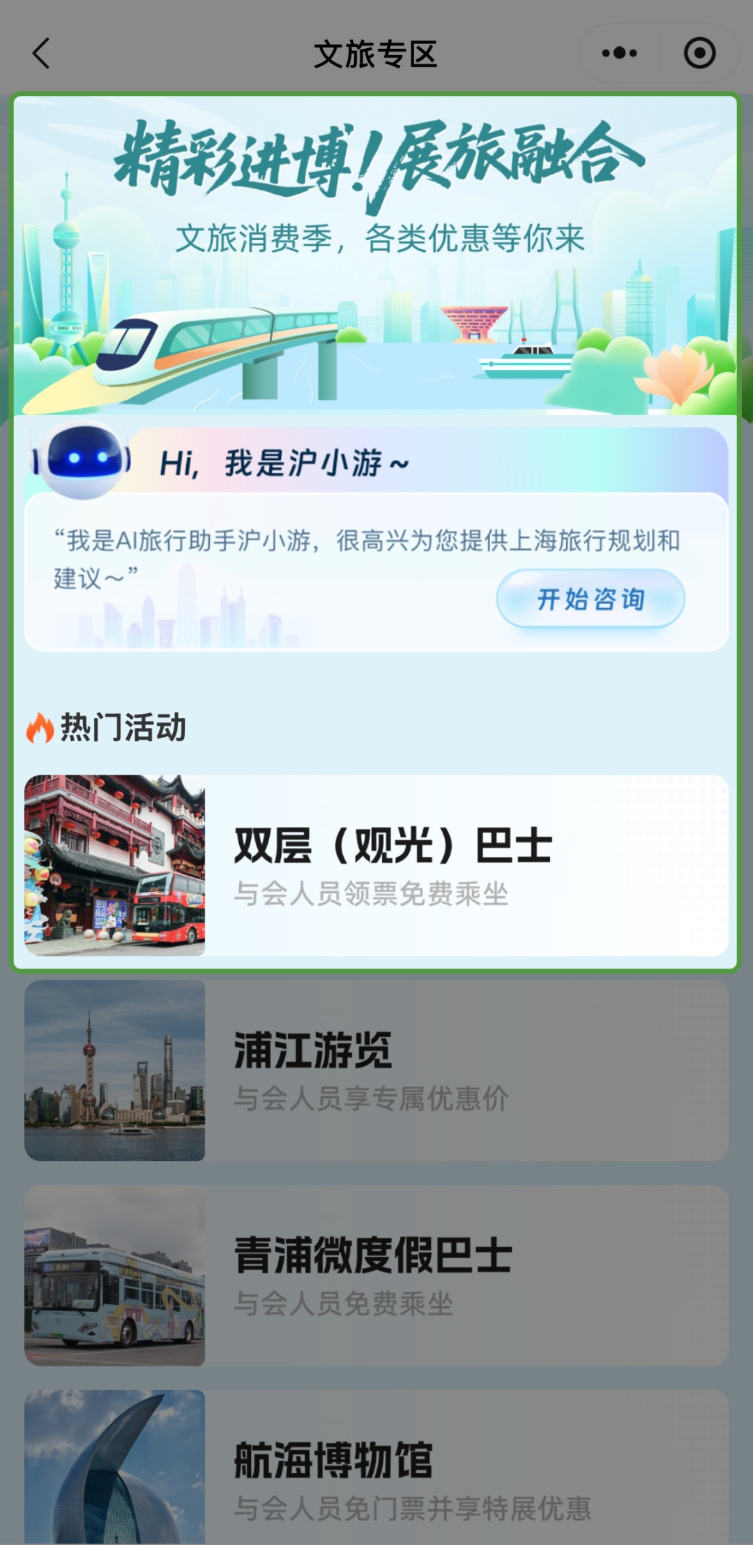 除11条双层观光巴士免费乘坐外,进博会期间还推出了浦江游览“精华游”专享优惠(100元/人)、青浦微度假巴士免费乘坐服务及中国航海博物馆免费参观等多重文旅特惠,均可在“随申行”平台“进博交通出行服务专区”内统一查询预约。