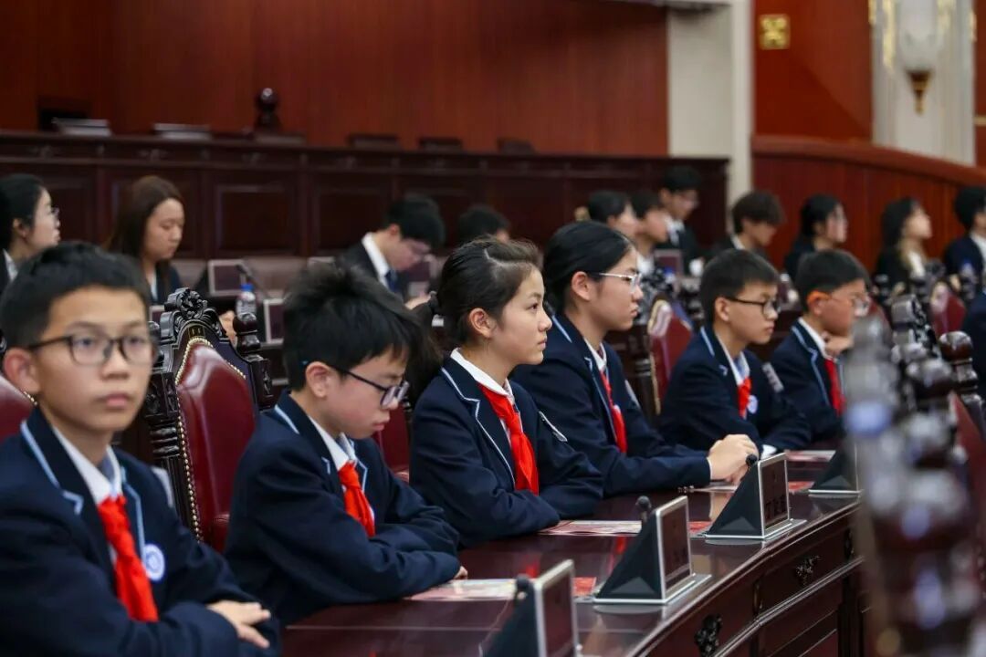 庄严肃穆的会议厅内,每一个座位都承载着代表人民履职的神圣使命。在模拟审议开始前,上海市人大常委会研究室宣传处工作人员为师生授课。之后,与会师生共同观看了市人大常委会履职片和会议厅介绍短片。这些视频资料带领大家回顾上海市人大常委会近年来的履职成果和人大代表的履职风采,并通过介绍学生参与议案修改的具体实例,让在场师生对人民代表大会制度有了更加直观而深刻的认识。