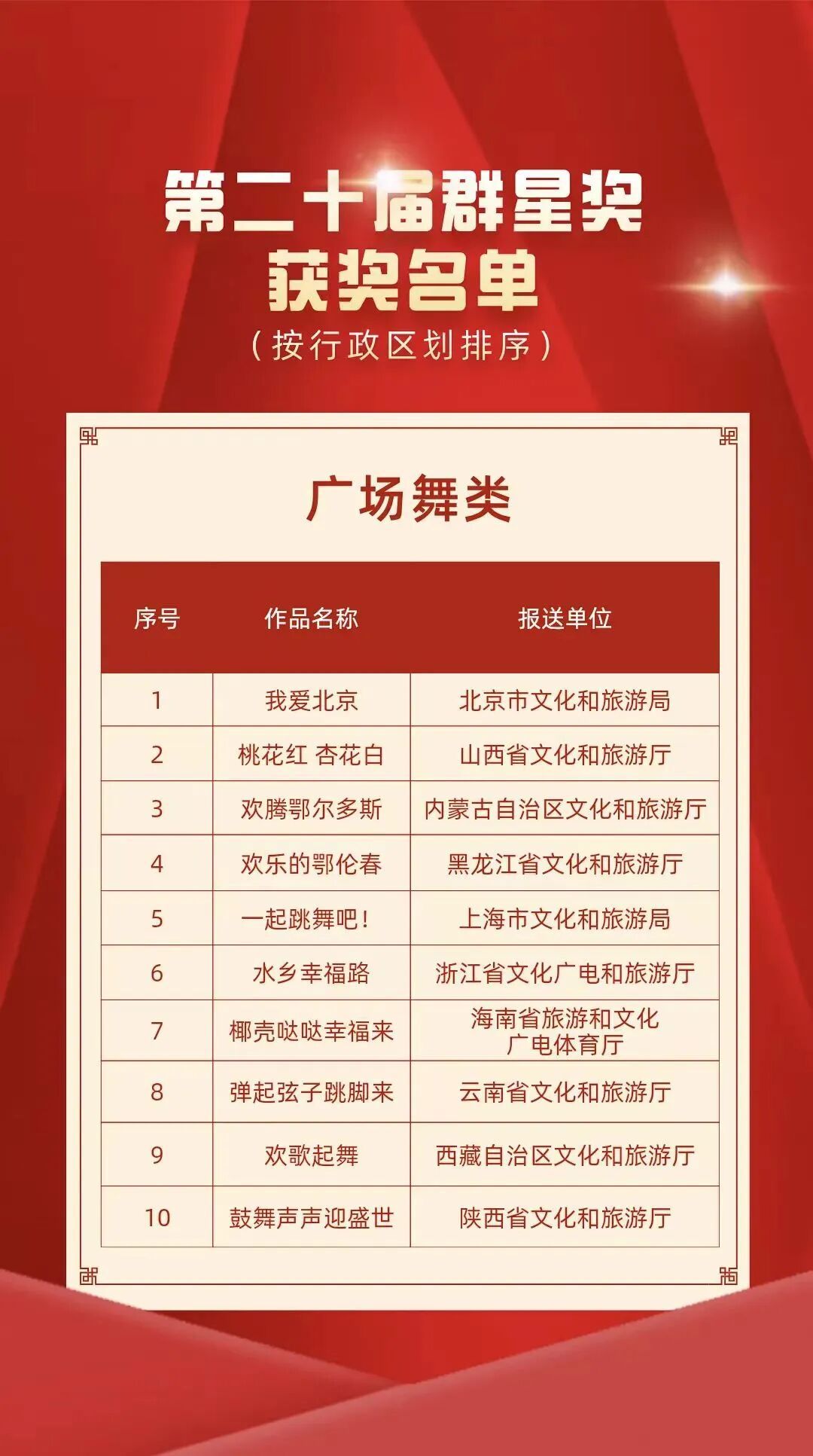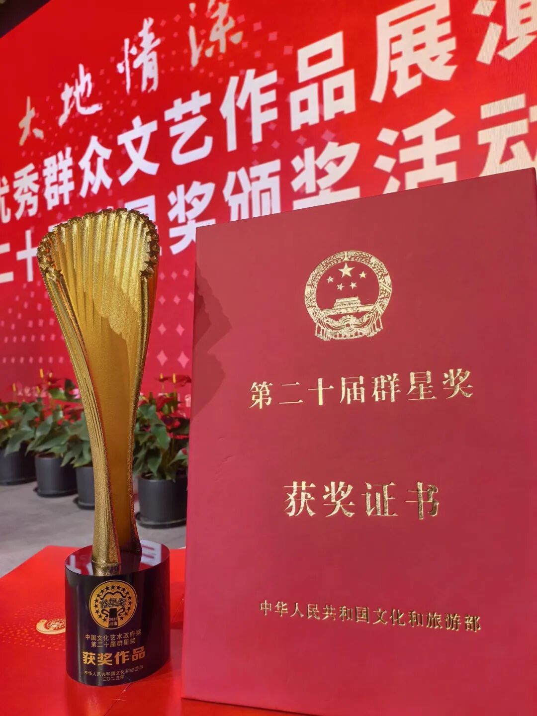 群星奖是文化和旅游部设立的国家文化艺术政府奖,作为群众文化领域的最高奖项,创立于1991年,每三年一届,分六大门类进行评选,包括音乐、舞蹈、戏剧、曲艺、群众合唱、广场舞。本届群星奖共有1996个演出单位的5039个作品(团队)、29.5万群众文艺工作者参评,经过初选、复评及终评,最终从全国报送的数千部作品中评选出60个获奖作品(团队)。