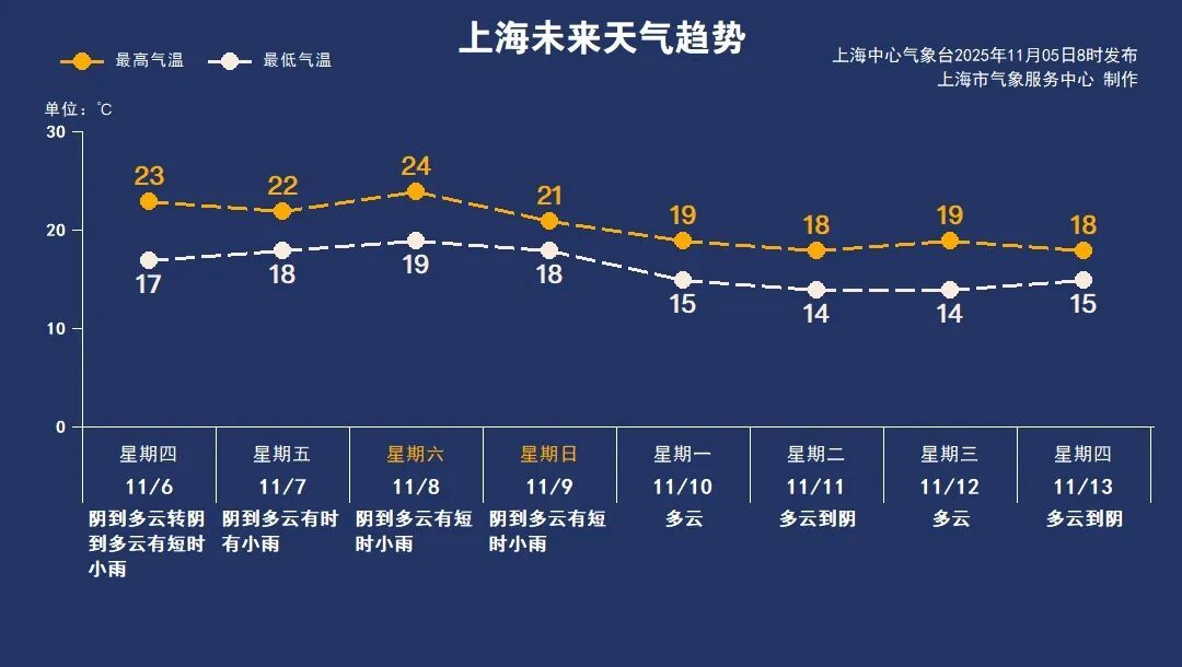 11月8日(周六):阴到多云有短时小雨,19~24℃