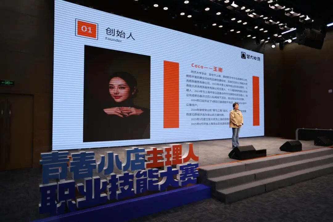 “皆大欢洗”的主理人王谢向评委与观众真诚分享一位从同济大学走出的创业青年,带着对生活服务的深刻理解与对社区温度的执着追求,创立了这家专注于洗护却不止于洗护的青春小店的创业故事。她以多元业务与社群运营为核心,从宠物专属洗护到节气主题服务,从旧衣回收到流浪动物救助,不断拓宽服务的边界,更在宝山的青年社区中建立起高黏性、有温度的私域社群。