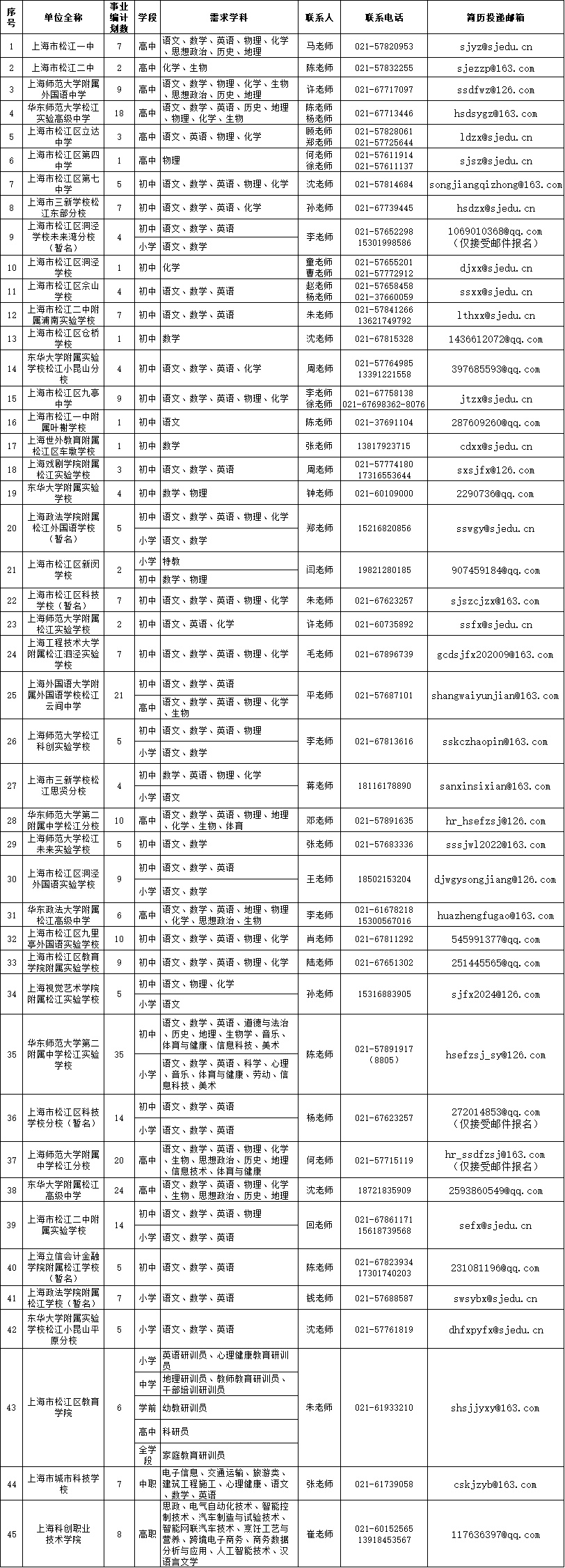 2026年松江区教育系统第一批教师招聘需求计划表