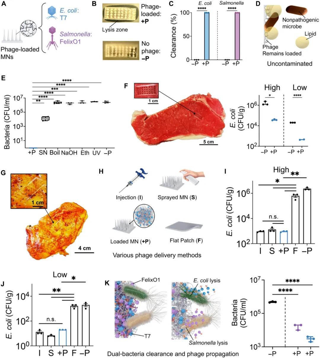 研究团队表示,噬菌体具备出色的环境稳定性,能够适应不同食品的存储和加工条件,而微针的递送方式则有效解决了传统表面喷洒噬菌体时,噬菌体难以渗透到食物内部、无法触及深层污染细菌的难题,实现了对食物的彻底杀菌。