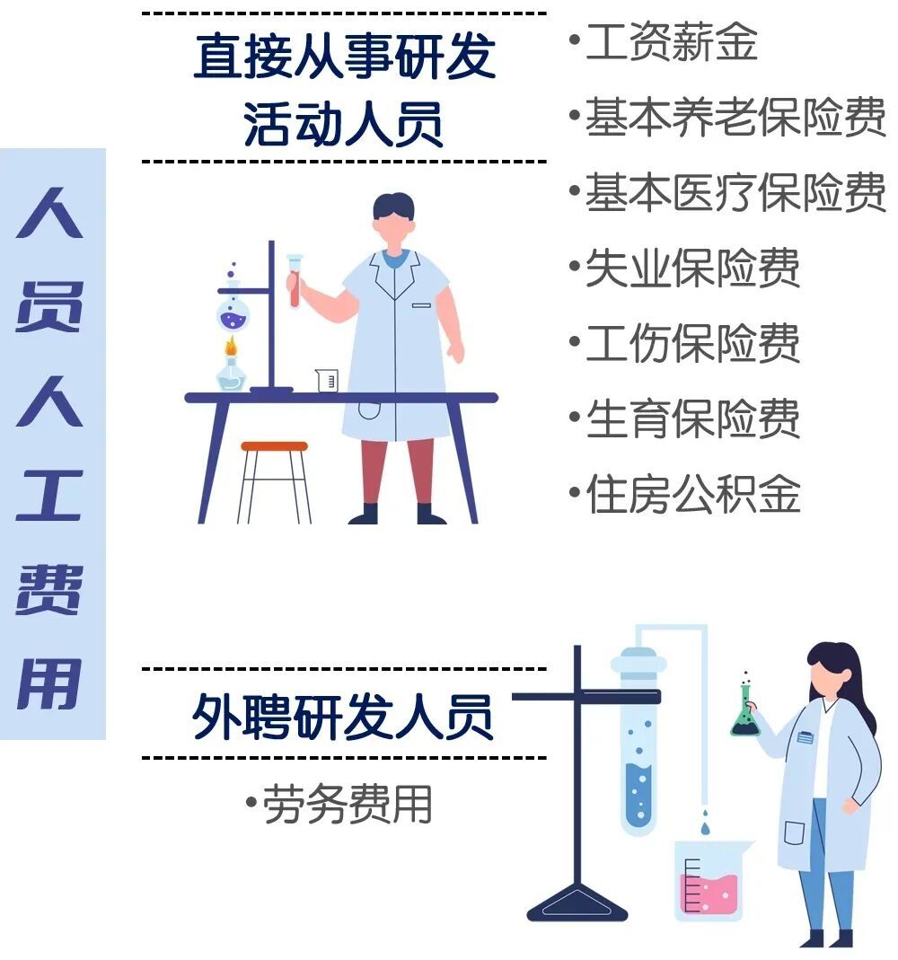 人员人工费用指直接从事研发活动人员的工资薪金、基本养老保险费、基本医疗保险费、失业保险费、工伤保险费、生育保险费和住房公积金,以及外聘研发人员的劳务费用。