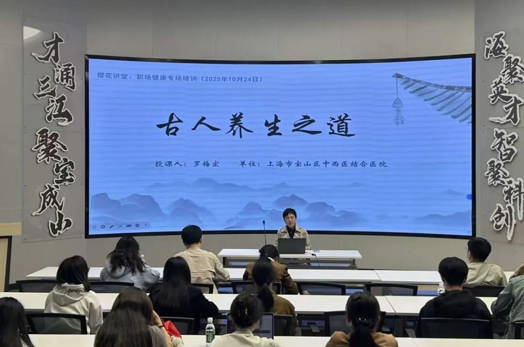 近日,宝山区人才工作局在宝山科创人才港举办2025年宝山区科创人才周系列活动之樱花讲堂(职场健康专场),精准回应人才群体日益迫切的职场健康管理需求,切实助力职场人才强化身心调适能力,以三场主题鲜明、靶向性强的专题讲座为核心,打造一场覆盖多方位的健康知识讲堂,活动共吸引宝山区30余名人才代表参加。