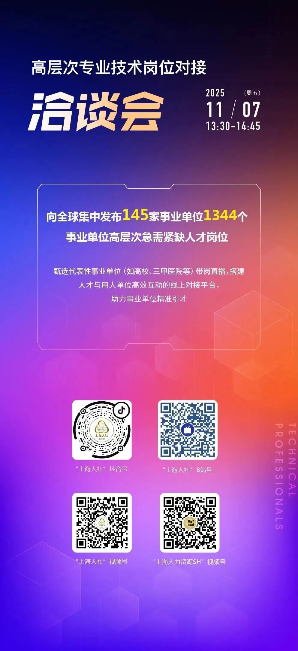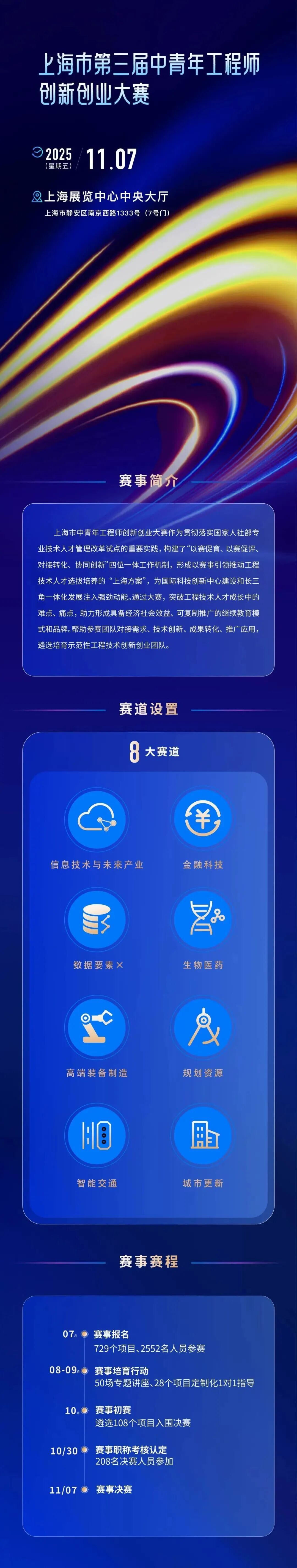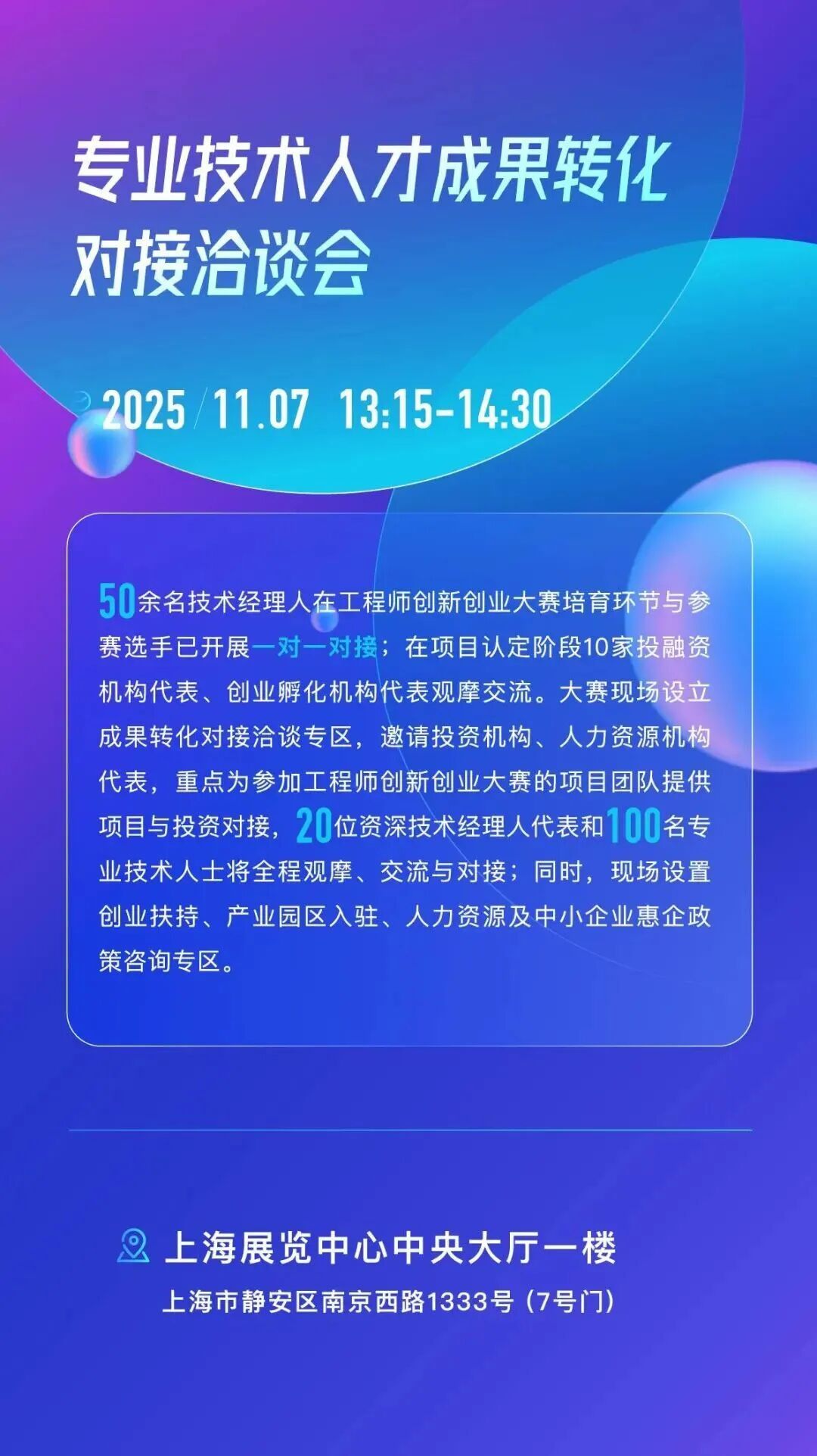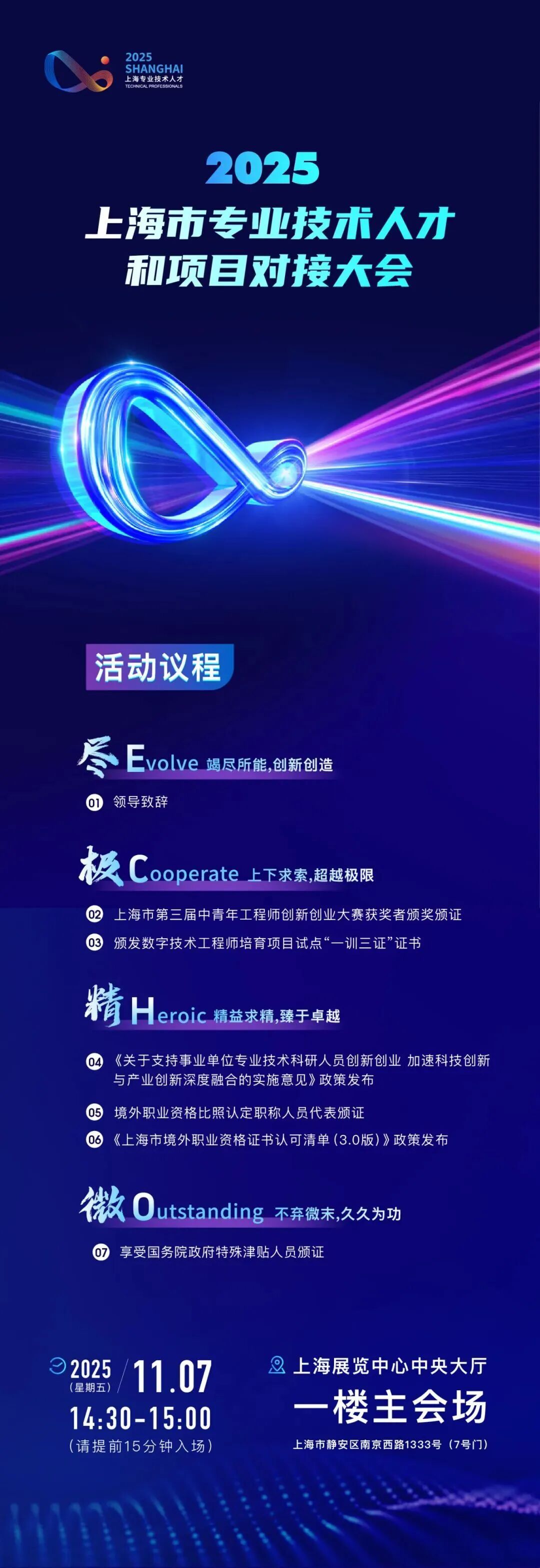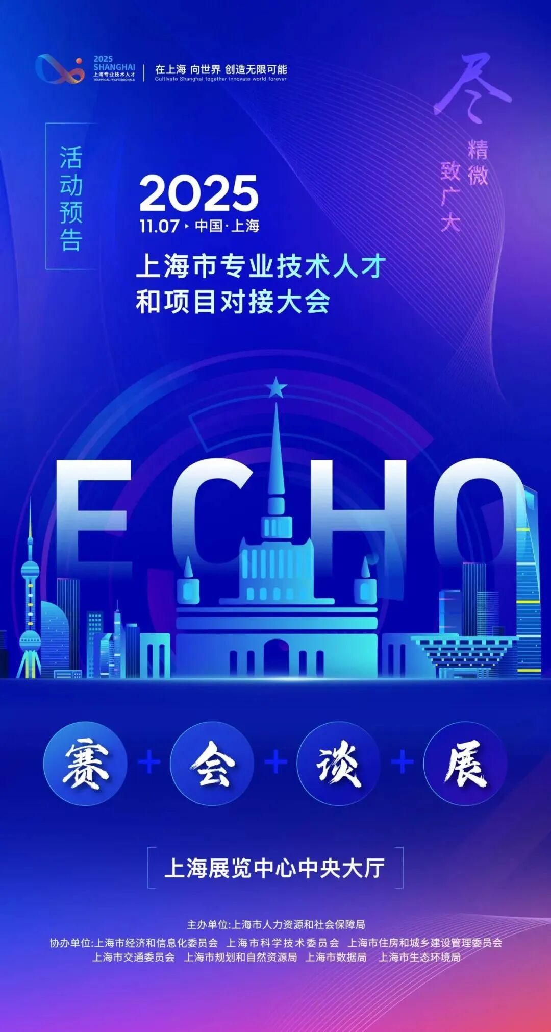 2025上海市专业技术人才和项目对接大会融合“赛会展谈”(“3C+1E”)多种形式呈现,以“在上海,向世界,创造无限可能”为主题,聚焦全行业全系列专业技术人才群体,搭建专业技术人才的交流、培育、竞技、成果转化展示以及新政宣传平台,诠释“尽精微而致广大”的上海专业技术人才精神。