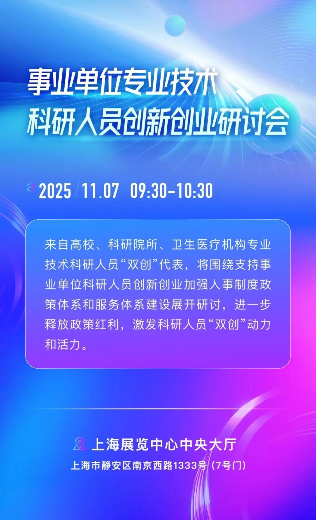 来自高校、科研院所、卫生医疗机构专业技术科研人员“双创”代表,将围绕支持事业单位科研人员创新创业加强人事制度政策体系和服务体系建设展开研讨,进一步释放政策红利,激发科研人员“双创”动力和活力。