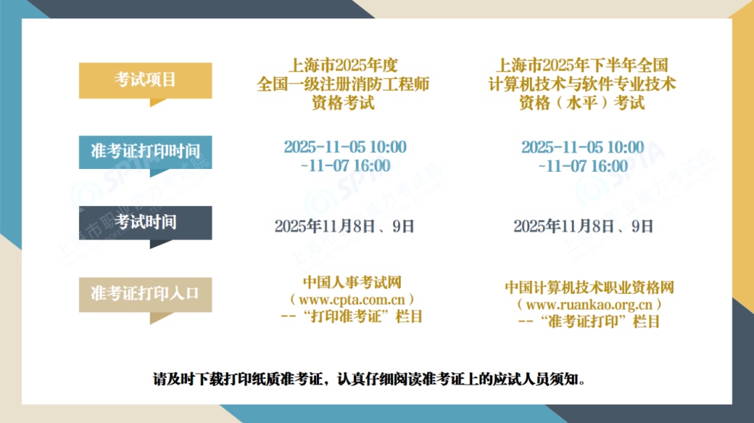 本市2025年度下半年全国计算机技术与软件专业技术、一级注册消防工程师资格考试临近啦!准考证打印通道今日10点开放,准考证打印时间和入口、应试须知及特别提醒已备好,快来看看吧!