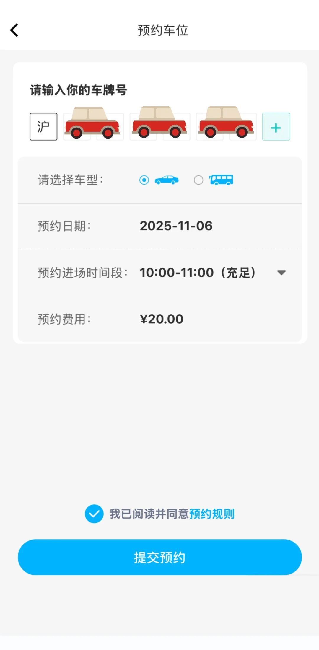 输入车牌号,选择车型,预约进场时间段。阅读停车预约须知,点击“我已阅读,并同意预约规则”后提交预约↓