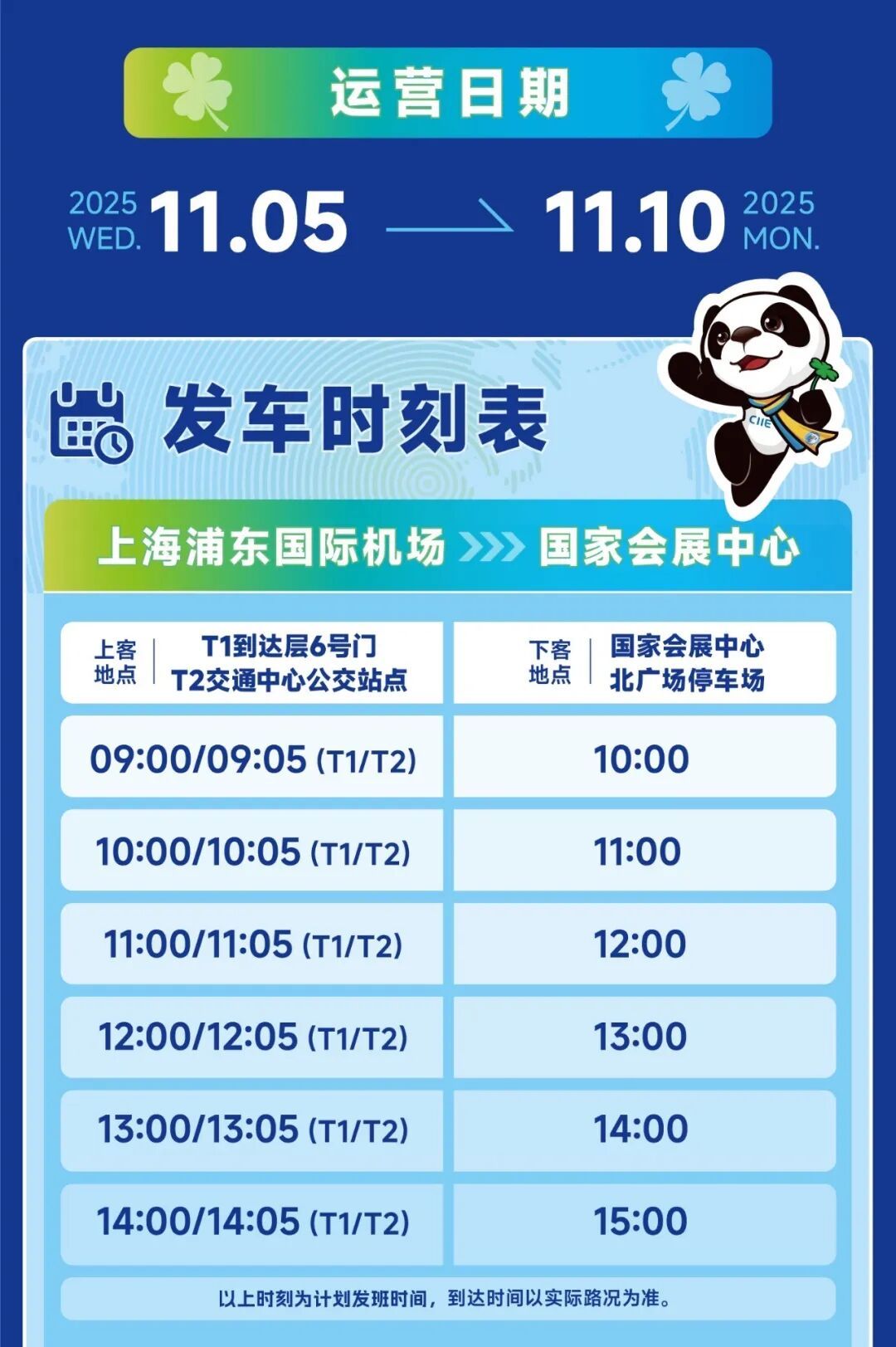 市交通委介绍,为了更好地服务展客商,11月5日至10日期间,开通上海浦东国际机场进博会定制专线,往返浦东机场和国家会展中心北广场,双向发班,定点直达。在哪里乘车?在哪里下车?发车时间是几点?一起来看↓