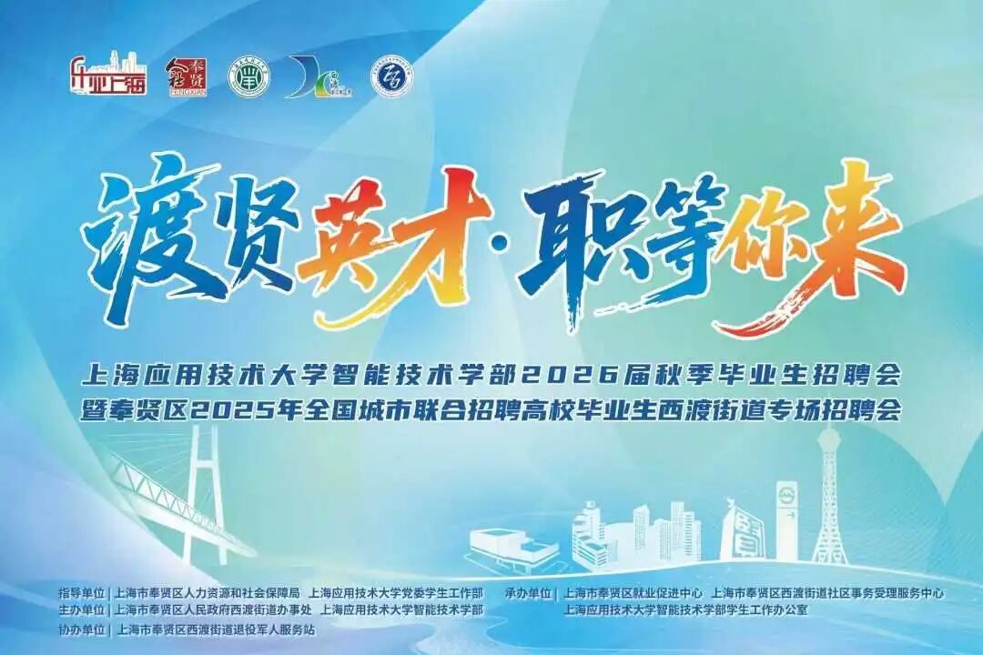 为促进高校毕业生就业、满足企业用工需求,西渡街道与上海应用技术大学智能技术学部携手,将于11月7日(星期五)在上海应用技术大学第二教学楼中庭,联合举办“渡贤英才 职等你来”——上海应用技术大学智能技术学部2026届秋季毕业生招聘会暨奉贤区2025年全国城市联合招聘高校毕业生西渡街道专场招聘会。