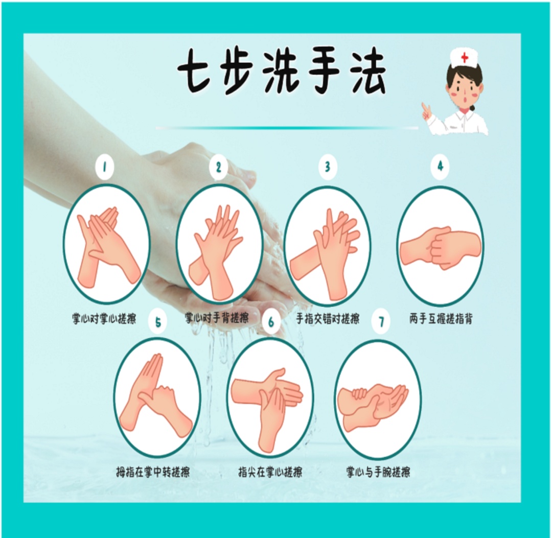 1. 洗手!洗手!洗手! 用流动水和肥皂(或洗手液),按照“七步洗手法”搓洗至少20秒(相当于唱两遍生日歌的时间)。没条件时,随身携带免洗洗手液(含≥60%酒精)。