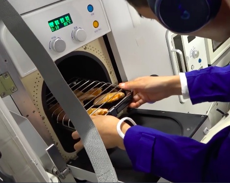 神舟二十一号乘组带去了一台新设备——热风烘烤机。他们与神舟二十号的“战友”会师后,迫不及待地拆开腌制好的鸡翅,用特制的签架固定好,送入这台机器。