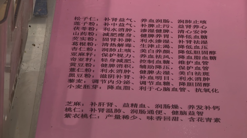 “我之前也是在线上旗舰店看到有小罐装的芝麻核桃粉,感觉非常适合年轻人,吃起来比较方便。今天到线下买是因为这里可以添加10多种营养粉。像我爸平时有点咳嗽,所以我也是特地加了一点杏仁粉,可以润肺。”“芝麻大家说吃了头发黑的,所以每年来买点,再配点杏仁粉,还有松子。杏仁是润肺的,松子是养颜的,所以对自己好一点。过几天再来买点给父母吃。”