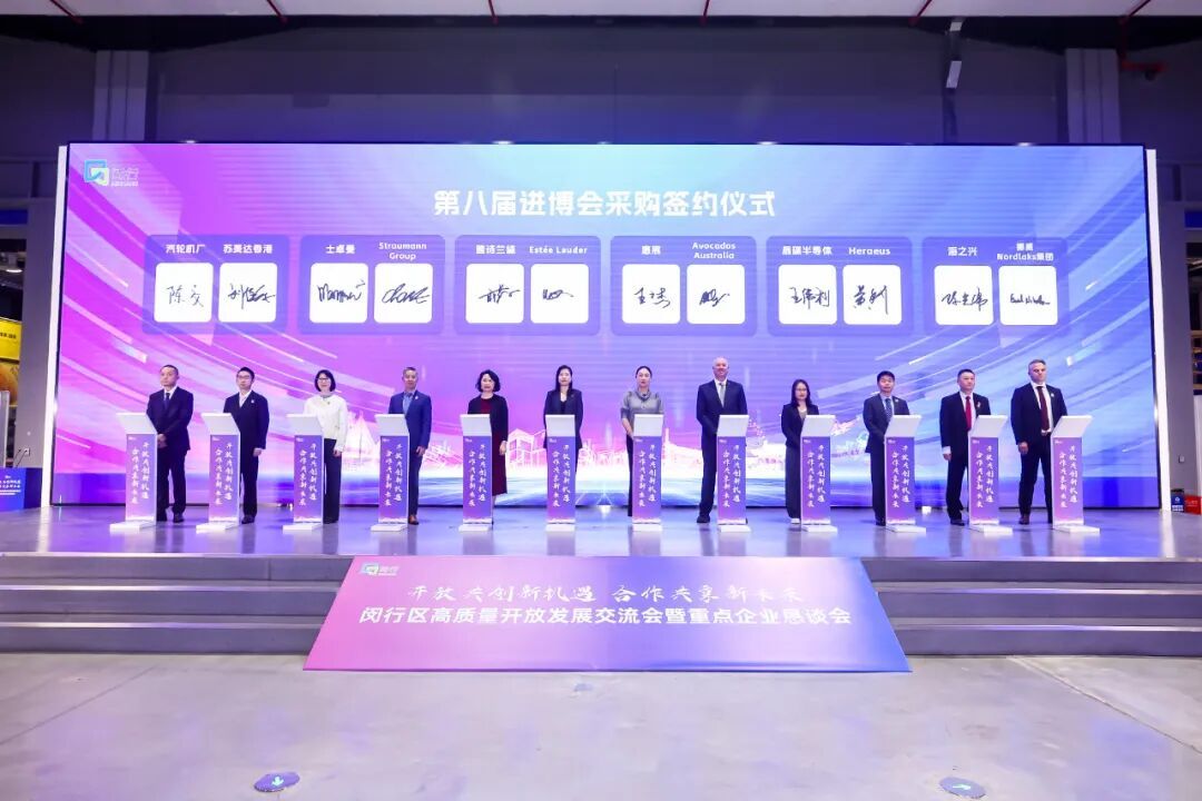 从进博会的“展品”到落地闵行的“商品”,闵行正以交流会为纽带,推动单一交易向长期合作转化,通过进博平台实现价值延伸。会上,雅诗兰黛、惠展国际、士卓曼等16家企业及平台现场完成意向采购签约。