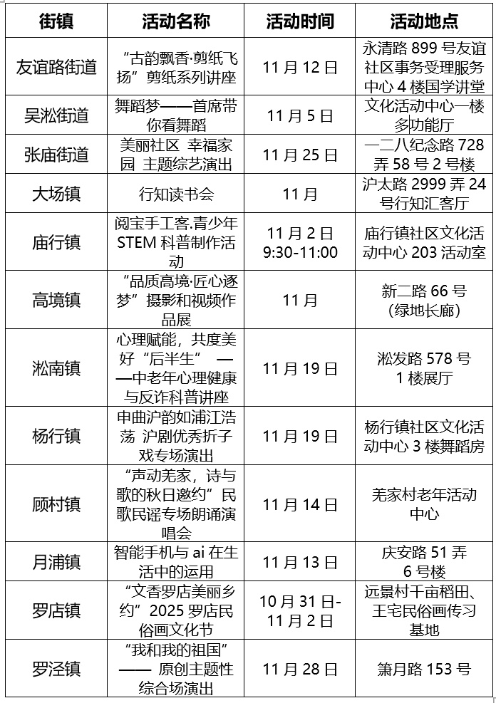 宝山文旅生活指南 十一月刊 十一月既有深秋的绚烂 又有初冬的静谧 它将春夏的热闹、秋日的丰盈 都沉淀下来 化作淡淡的诗意 在这个温柔而沉静的月份里 区文旅局精心筹备了一系列活动 邀你一同捕捉季节的绚烂 区级重点文旅活动 宝山区文化馆 十一月活动 时间:11月 地点:宝山区文化馆等 点击这里了解详情 一起来打“动作僵尸” 儿童文学名家系列活动 时间:11月15日 地点:“昊耀书苑”共享书房(蕰川路1999弄10号昊耀商业广场3楼) 了解活动详情请关注微信公众号“上海市宝山区图书馆”后续推文 万物之色 民艺新生 第六届上海民间艺术 成果展 时间:截至12月7日 地点:上海宝山国际民间艺术博览馆 点击这里了解详情 万物之色 民艺新生 第六届上海民间艺术 成果展美育活动 时间:11月9日、11月16日 地点:上海宝山国际民间艺术博览馆一楼活动区 了解活动详情请关注微信公众号“上海宝山国际民间艺术博览馆”后续推文 “二十四节气 传承华夏之美”主题系列活动 时间:11月22日 地点:上海宝山国际民间艺术博览馆一楼活动区 11月22日活动详情请关注微信公众号“上海宝山国际民间艺术博览馆”后续推文 社区美术馆展览 时间:11月 地点:沈杨村901欢乐农场、保利叶之林会所一楼大厅(华秋路349弄) 了解活动详情请关注微信公众号“文旅宝山”后续推文 可点击图片放大观看 友情提醒: (文中活动请以现场实际情况为准)