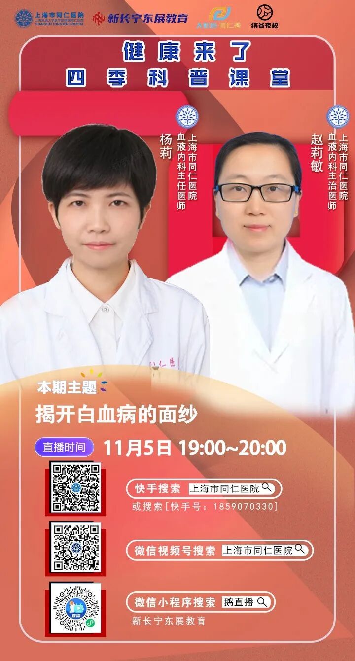 今天(11月5日)19:00—20:00,“上海长宁”App将与上海市同仁医院“大虹桥·同仁荟健康直播”共同直播:揭开白血病的面纱。