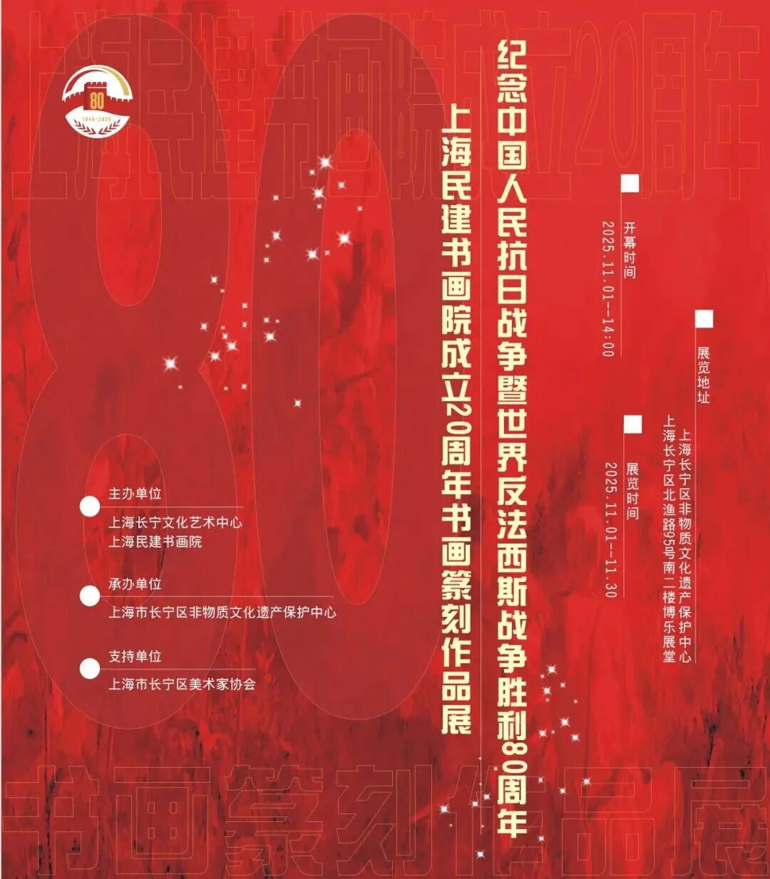 今年是中国人民抗日战争暨世界反法西斯战争胜利80周年,也是上海民建书画院成立20周年。值此之际,长宁区非物质文化遗产保护中心以书画篆刻为媒举办此次展览,既为铭记烽火岁月中的民族精神,亦为传承文化艺术的时代薪火。每一幅作品,皆是艺术家对祖国的深情讴歌;每一方印,皆为文化传承的铿锵回响。愿此次展览继续以艺术之力,凝聚人心,启迪未来,为海派文化再添璀璨篇章。