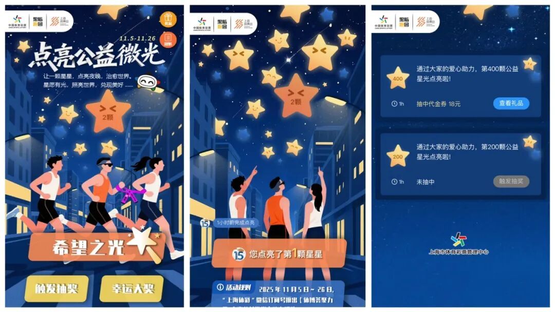 11月5日-26日,上海体彩推出“体博荟聚力量 点亮公益微光”爱心助力活动。活动期间,参与者可通过上海体彩微信助力,点亮一颗希望星光。随着每一颗公益微光的亮起,上海体彩中心将为黑暗跑团残障人士捐赠2元公益资金。同时,参与助力用户有机会赢取18元大乐透代金券或200元顶呱刮即开票礼品。