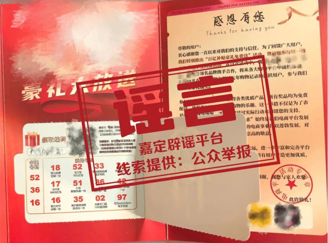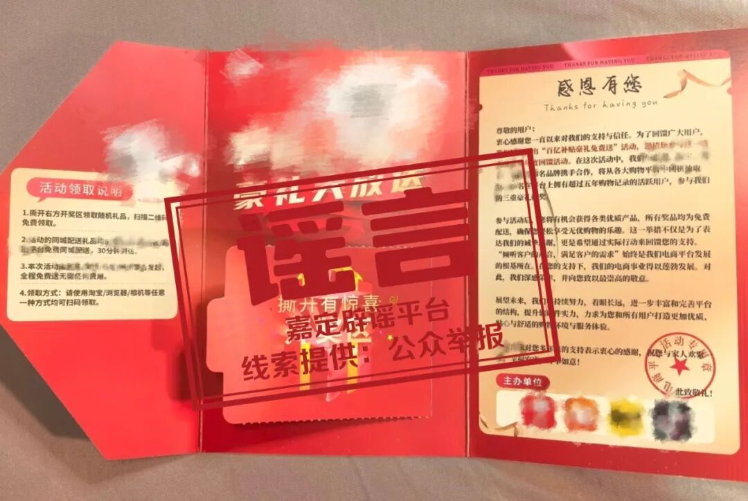 近日,徐行派出所接到一位市民反映,自己近期并未网购,却突然收到一个快递,打开里面有一张“豪礼大放送”活动宣传卡片,不仅可以参与“百亿补贴豪礼免费送”活动,还中了大奖。这是天上掉馅饼了吗?