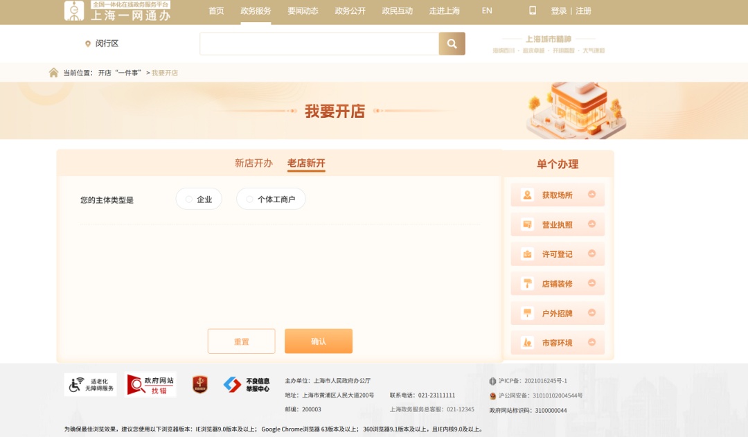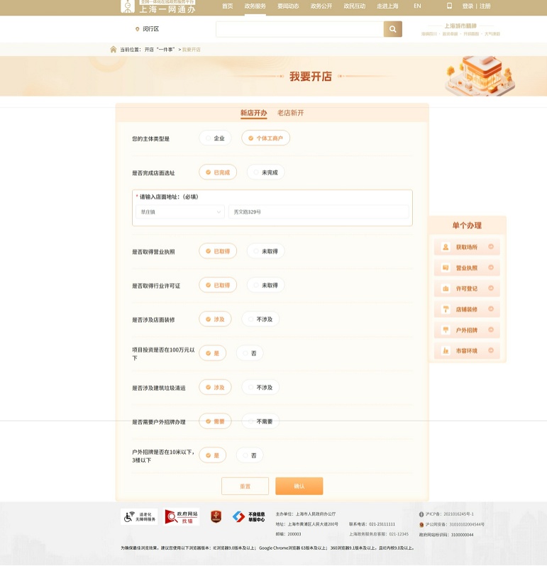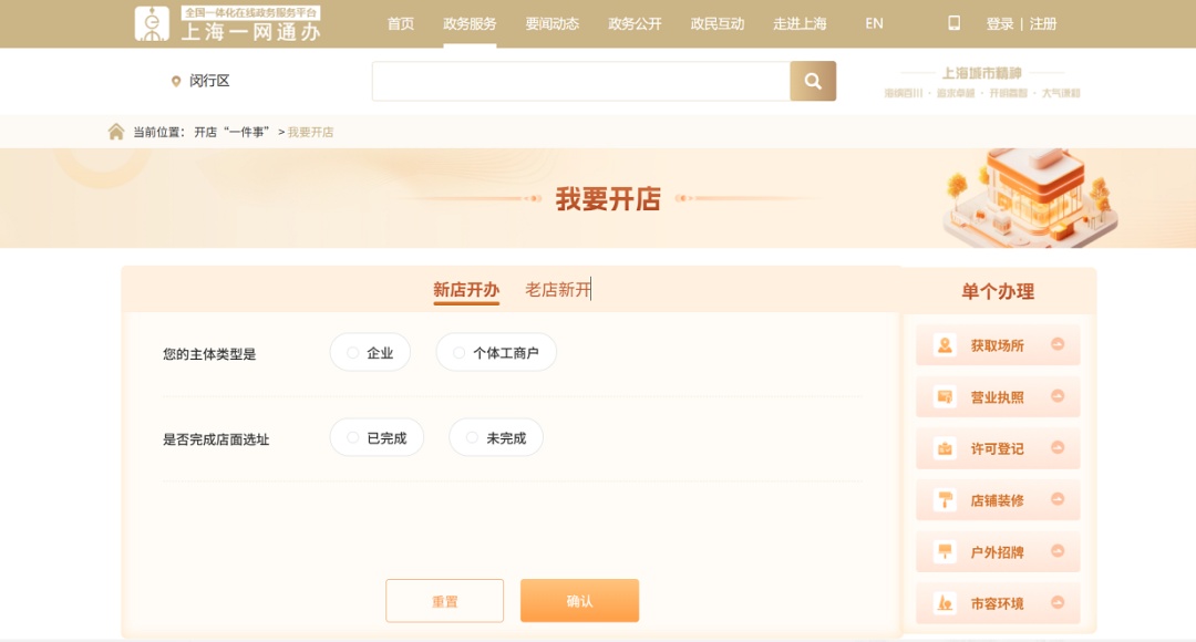 线上办理:“一网通办”平台——闵行频道——闵行区开店“一件事”