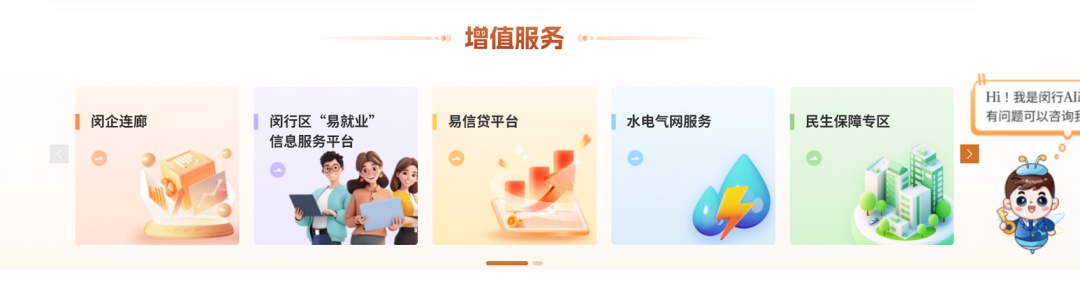 闵企连廊政策平台、易就业信息服务平台、易信贷平台、水电气网服务、民生保障专区等服务。