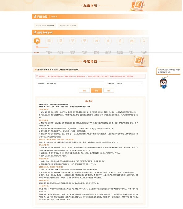 若未完成选址,系统将引导您进行选址禁设场所查询,查询后会显示“选址分析”供参考。(仅限餐饮行业)