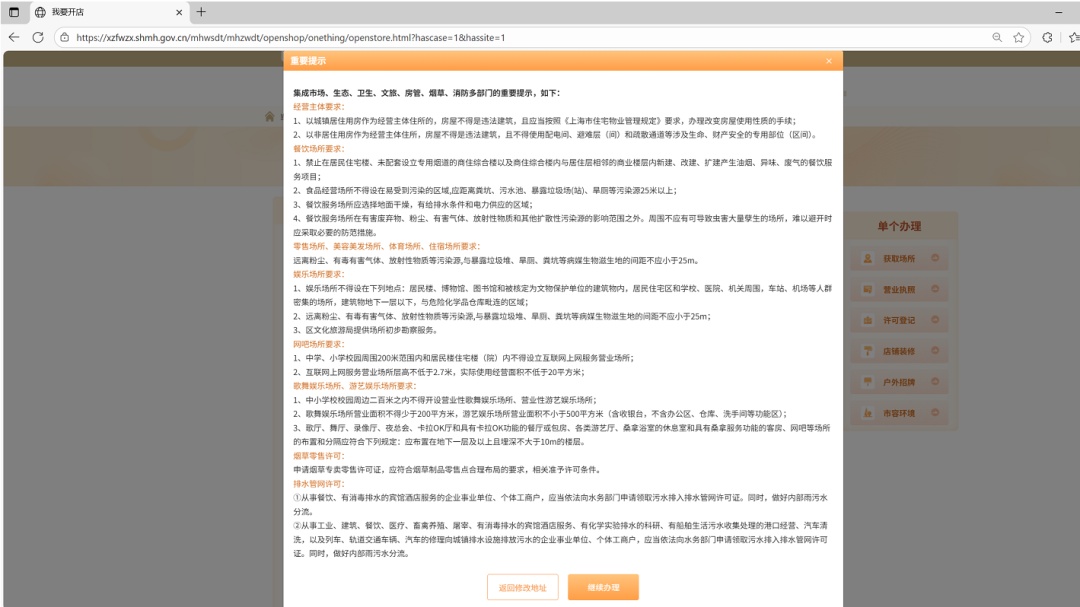 点击“确认”后,系统将结合地址智能推送开店注意事项。