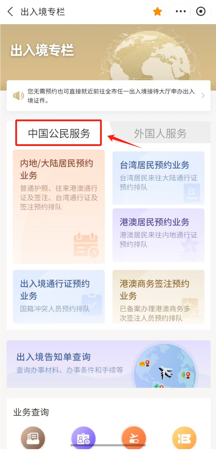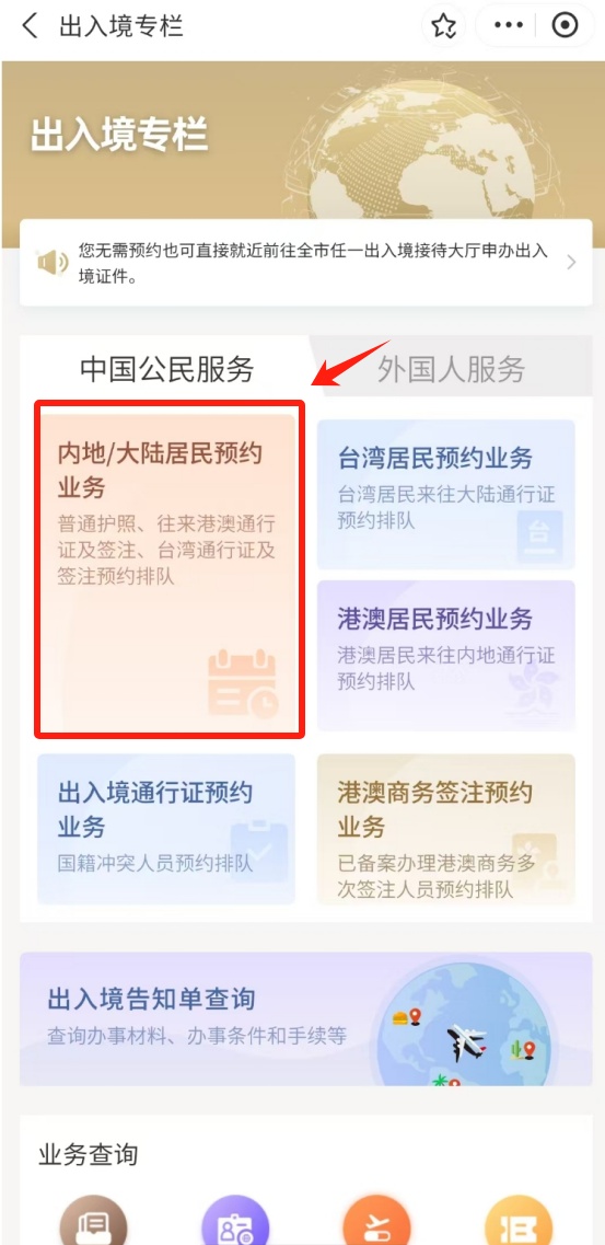 2、以“内地/大陆居民业务”为例,在“中国公民服务”栏目下找到入口,仔细阅读申请须知后,按页面提示完善申请信息,按时前往出入境接待大厅办理即可。