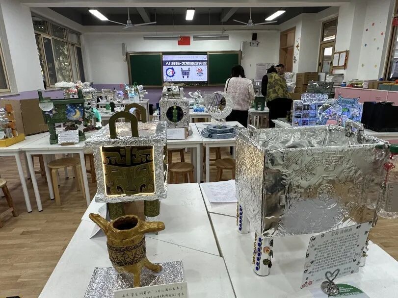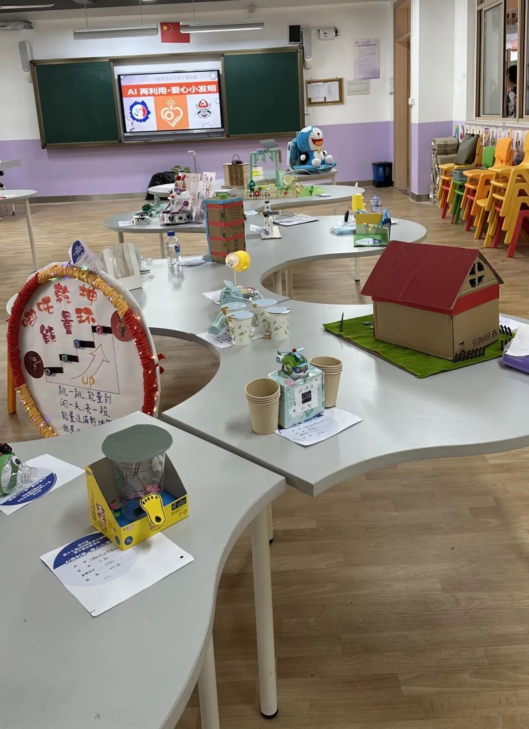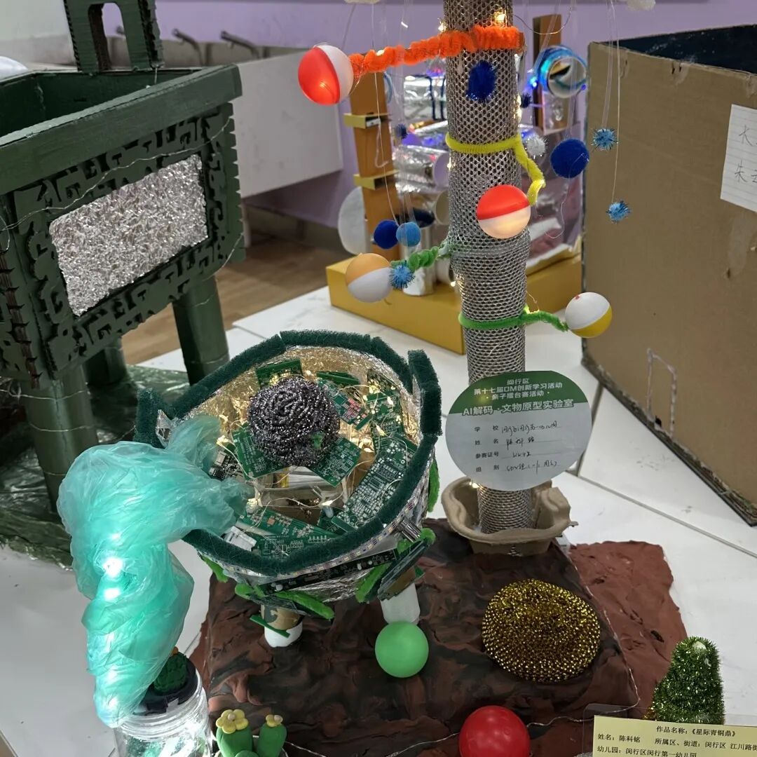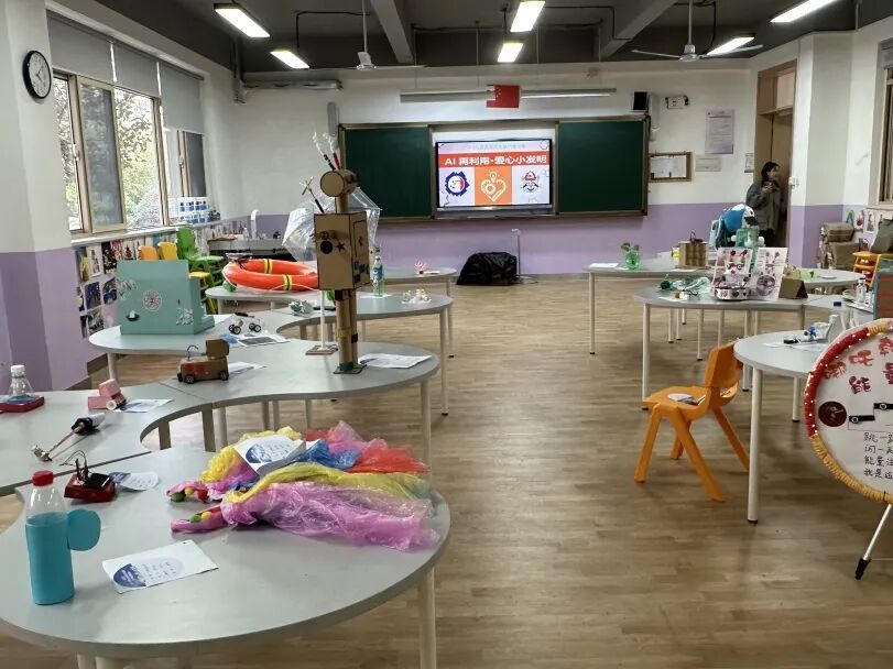 “AI再利用・爱心小发明”赛场里,废旧文具、旧玩具等被赋予新的生命,变成了实用的小工具、暖心的小物件,展现了环保理念与创新精神。