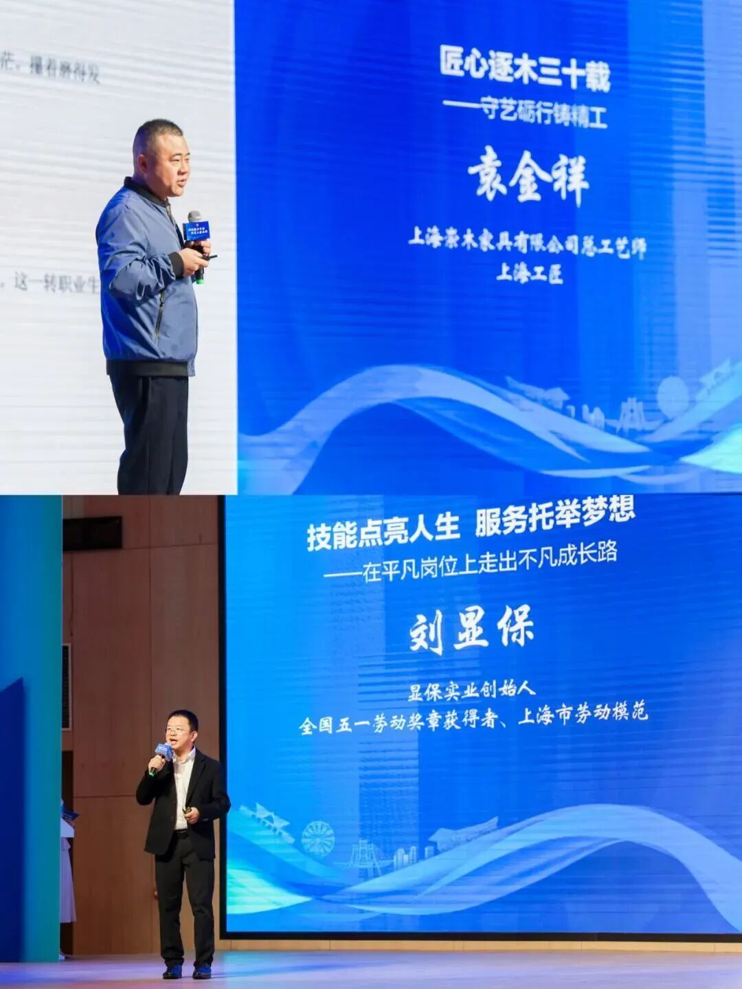 活动还邀请了显保实业创始人、全国“五一劳动奖章”获得者、上海市劳动模范刘显保,上海崇木家具有限公司总工艺师、上海工匠袁金祥两位先进代表分享他们的成长经历。