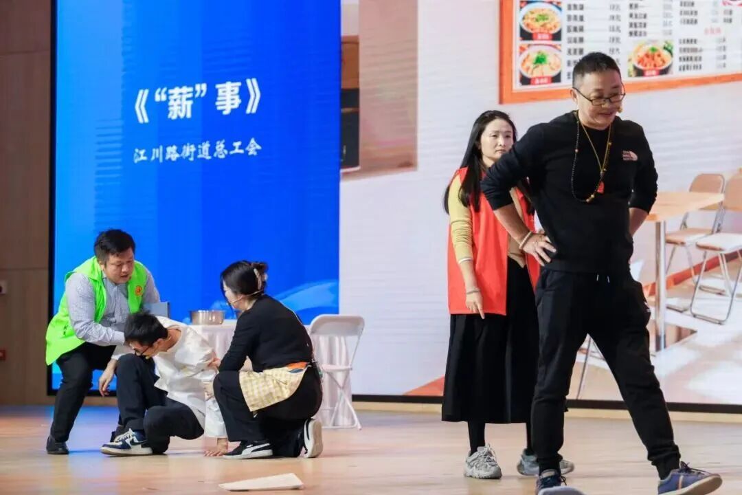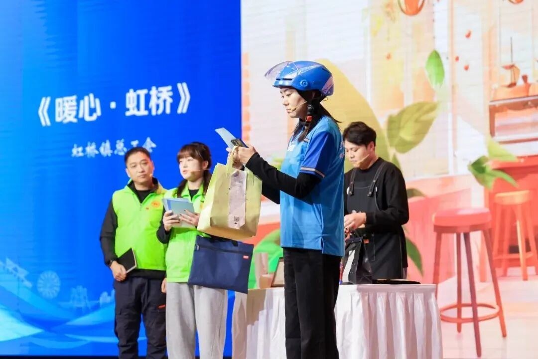 除此之外,闵行区各街镇参赛队伍还带来了大大小小的民生百态,虹桥镇总工会从一杯咖啡、一项车票补贴政策切入,讲述工会如何让外卖小哥找到了“娘家”的归属感;新虹街道总工会细腻刻画工会社工以真诚化解企业疑虑,成功搭建企业与职工的“连心桥”;莘庄镇总工会演绎“职汇莘社区”如何成为快递小哥的“歇脚地”和困难职工的“暖心人”;浦锦街道总工会以青年职工的视角,温情展现了工会陪伴一名职场新人从迷茫走向成熟……