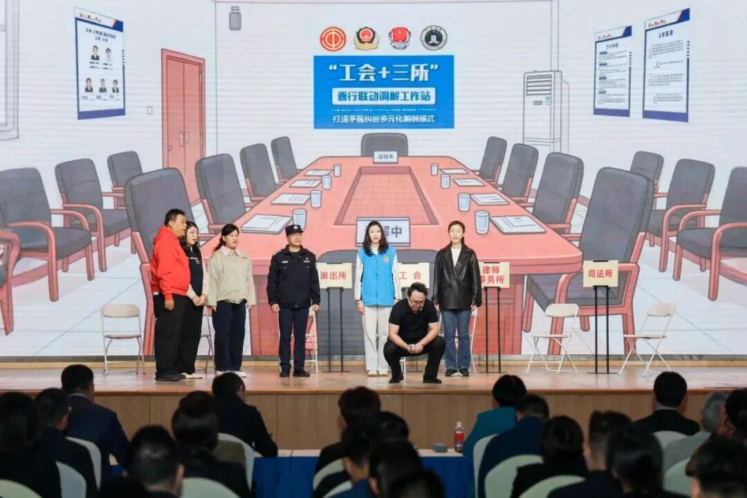 舞台上,一家食品公司经营困难,导致职工生活愈发困顿。随着企业全面停产,职工与企业的矛盾愈发尖锐。就在矛盾即将爆发的边缘,工会社工联动属地派出所、律师事务所、司法所工作人员抵达现场。经过一段时间对职工代表的情绪疏导,以及与企业主的沟通协商,最终依法依规保障了群众利益。参与演绎的梅陇镇总工会社工周雪屏告诉记者,这一幕情景剧背后是一个真实案例。现实中,在“工会+司法所+派出所+律师事务所”四方联动调解模式下,社工们连续一周驻厂,在现场耐心劝解,最终促成职工代表和企业主达成共识,在72小时黄金时间内恢复了厂区社会秩序,为企业144位职工守住了切身利益。