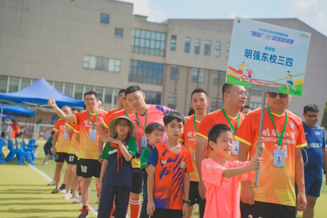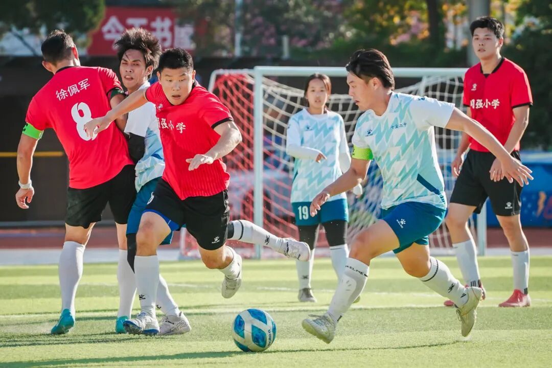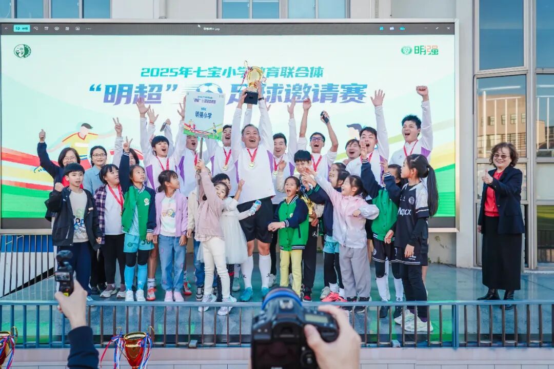决赛日,明强小学东校区球场边,四年级学生徐亦凡紧盯父亲的身影。当父亲用头球破门,拿下关键一分时,他与同学们跳起来欢呼:“我为他骄傲!我以后也要像他一样,在学习和锻炼中奋力一搏。” 一场持续54天、涵盖20支队伍、吸引400余名参赛者的八人制足球赛,近日在闵行区七宝镇明强小学落下帷幕。这场名为“明超”的足球邀请赛,以其独特的“家长、教师踢球,学生观战”模式,在家、校、社之间完成了一次“完美组队”。