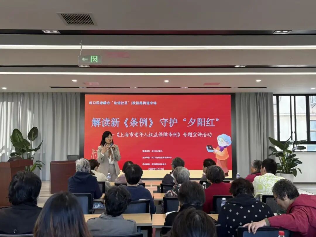 虹口区紧扣新《条例》关键内容,通过贴近生活的讲解和具象化的案例,让抽象的法律条文变得可感、可知、可用,推动“依法养老”从理念走向行动。活动特别邀请上海华夏汇鸿律师事务所高级合伙人、深度参与新《条例》修订工作的燕晓凤律师领衔的专业宣讲团队,深入社区一线,以精准专业的普法服务,将法律知识送到老年群众身边,切实增强老年群体对新《条例》的理解力和认同感。